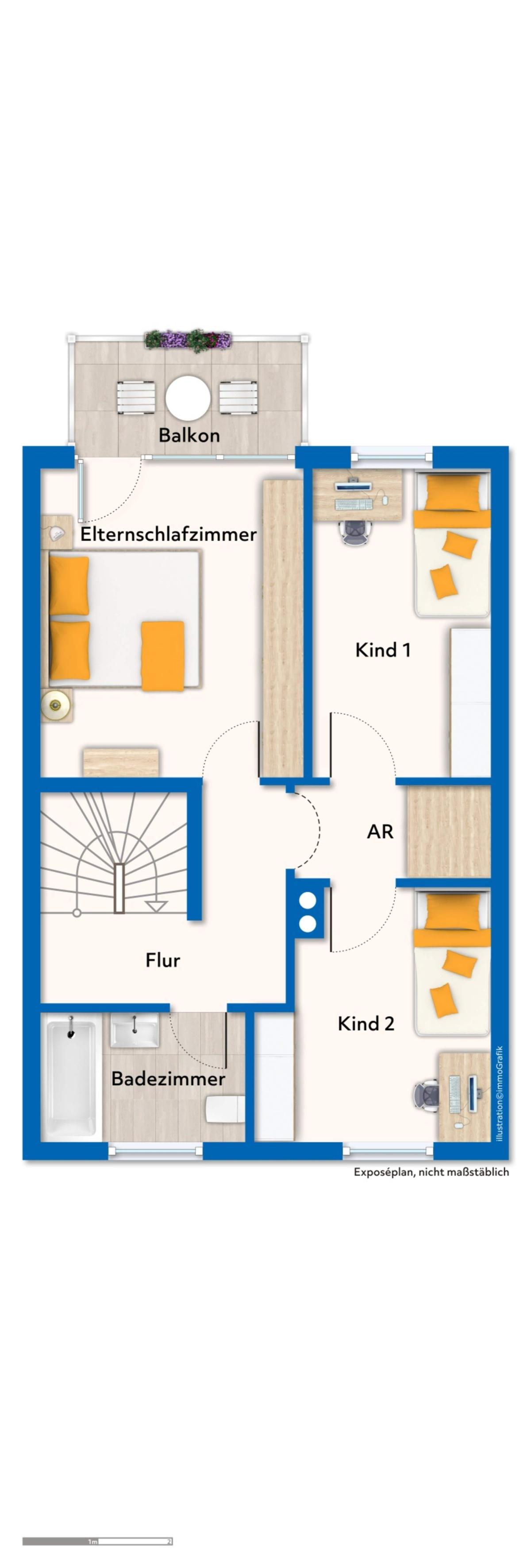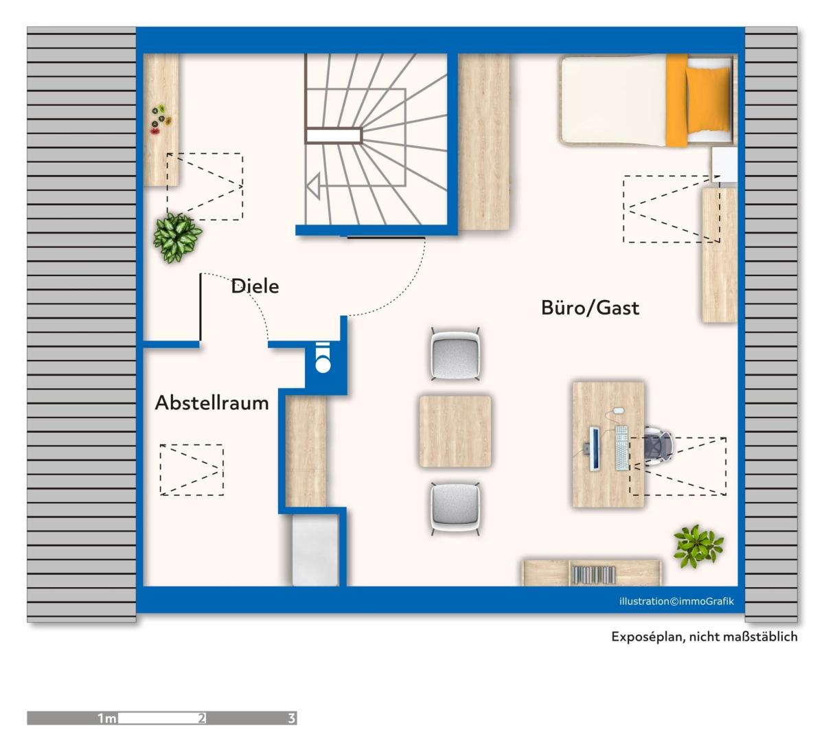 Das ausgebaute Dachgeschoss ist ein echtes Highlight. Ob als ruhiges Home-Office, gemütliches Gästezimmer oder kreatives Reich für die Kinder – hier gestalten Sie Raum nach Ihren Wünschen. Clevere Stauraumlösungen unter der Schräge und ein angrenzender Abstellraum sorgen für Ordnung.