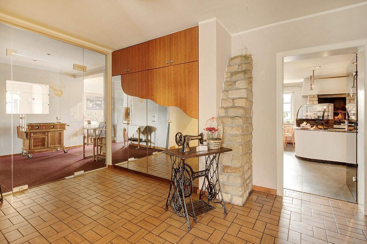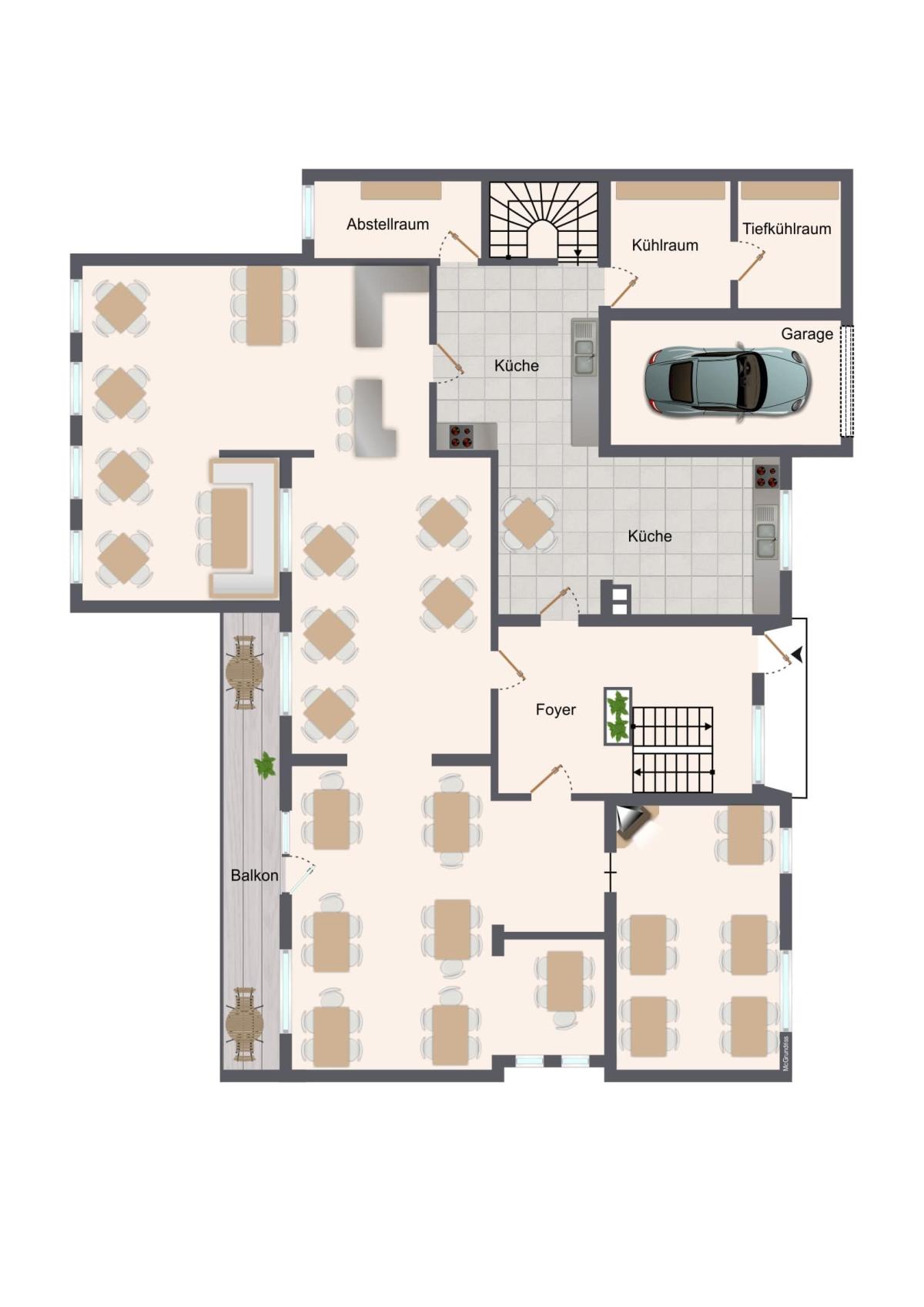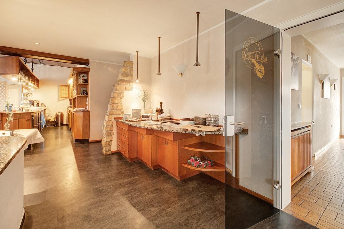 Ein ansprechendes Foyer öffnet den Zutritt zum Erdgeschoß. Auf dieser Ebene, mit einer Fläche von rd. 270 m², befinden sich vier zueinander offen gestaltete Räume, welche bislang den Gastraum des Restaurants bildeten. Daran angegliedert sind die vormalige Küche mit mehreren Zugängen, sowie weitere Funktionsräume an.