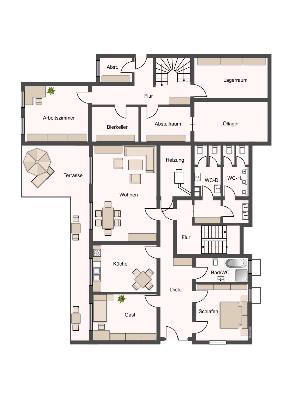 Im Untergeschoß befinden sich Toilettenanlagen und diverse Lagerräume. Auch die Haustechnik und die Heizung haben hier Ihren Platz. Eine Einliegerwohnung mit separatem Eingang verfügt auf einer Wohnfläche von rd. 90 m² über drei Zimmer, Küche, Bad und Terrasse.