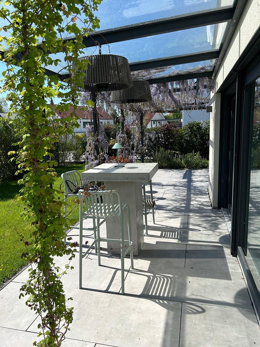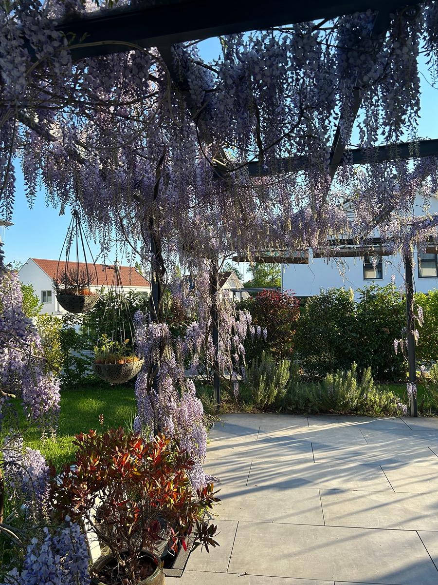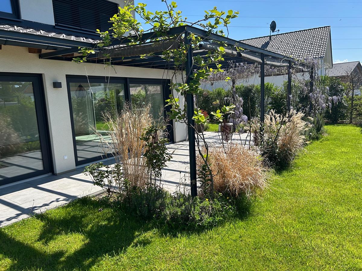 Die zweite Wohnung im Erdgeschoss und OG umfasst ca. 165 qm. Sie verfügt über einen tollen Garten mit einer großen teil-überdachten Pergola.