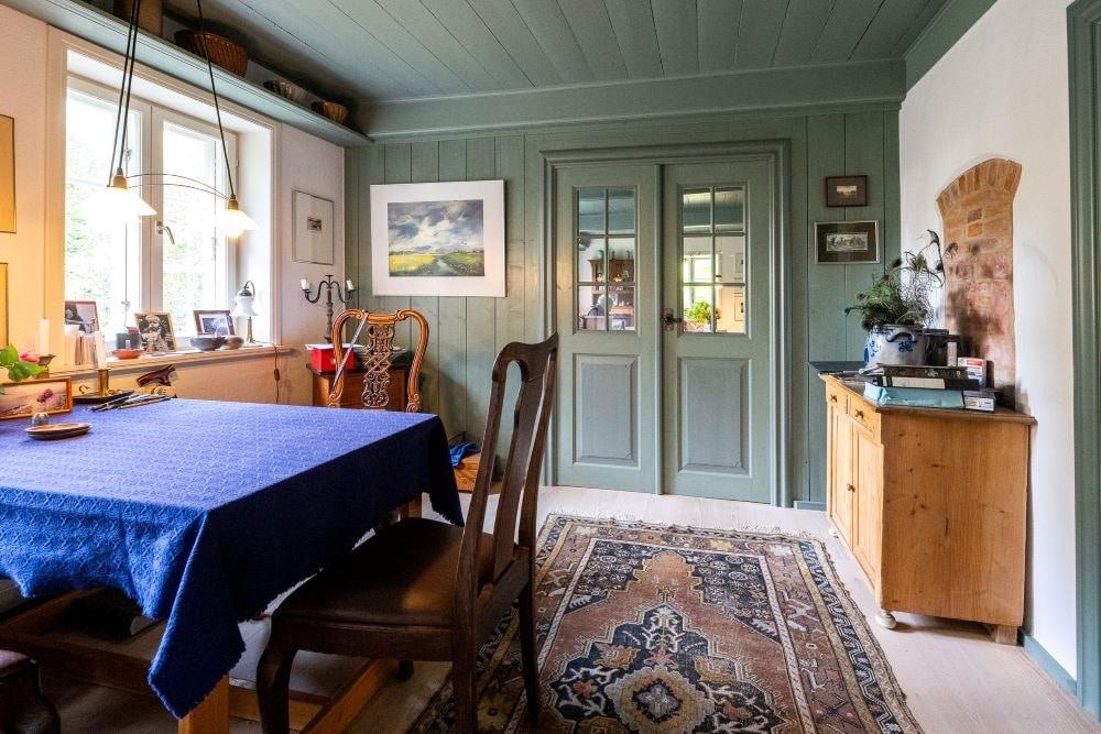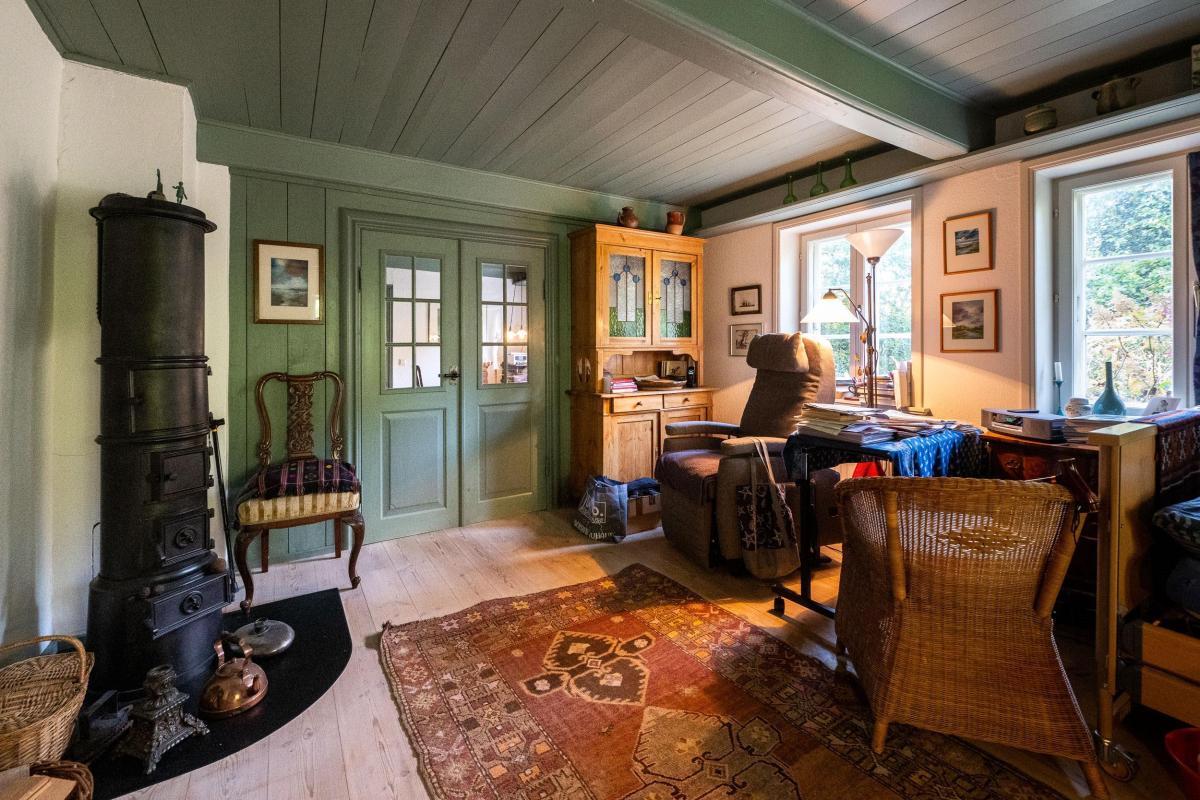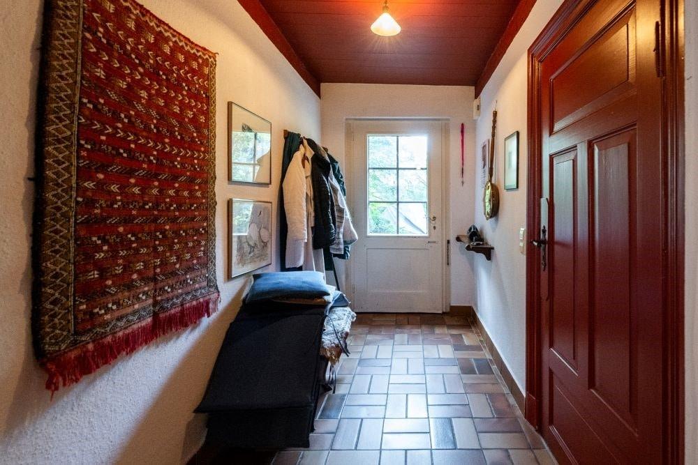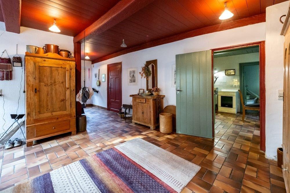 Im Innern des Hauses zeugen diverse Einbauten und Details von einer bewegten Vergangenheit. Im Norden steht parallel dazu die Stallscheune, die über einen reetgedeckten Verbindungsbau an das Bauernhaus angeschlossen ist.