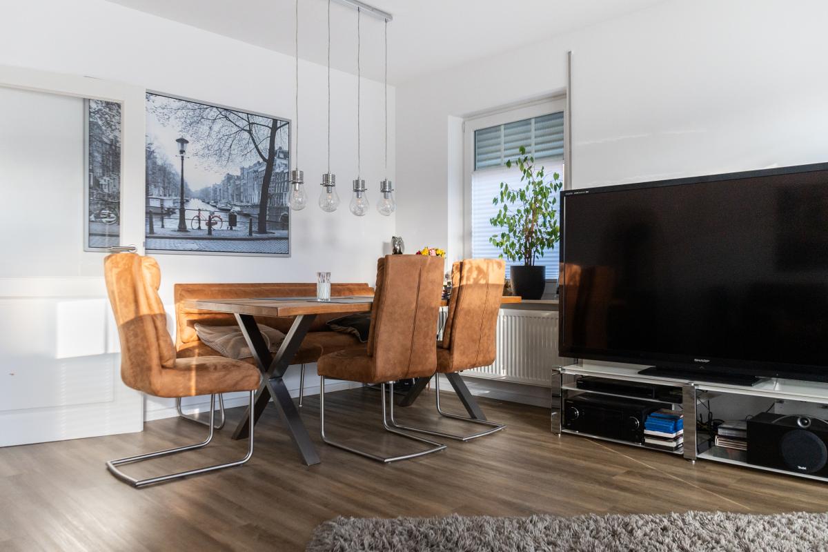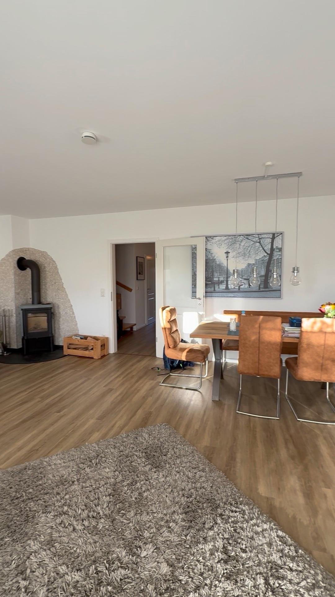 Der offene Wohn- und Essbereich mit gemütlichem Kamin schafft eine warme Atmosphäre – ideal für entspannte Abende mit Familie oder Freunden. Vom Wohnbereich aus geht es auf die sonnenverwöhnte Terrasse, die bereits über eine Markise verfügt. Der Blick in den eigenen Garten, während der Kaffee dampft – einfach unbezahlbar.