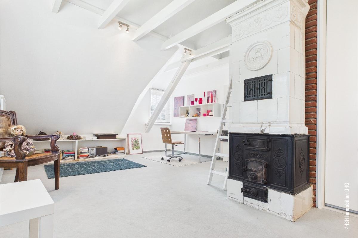 Im oberen Stockwerk befinden sich das luxuriös ausgestattete Vollbad sowie zwei sehr geräumige Zimmer die für Ihre individuelle Wohnbedürfnisse bestens geeignet sind sei es als Schlafzimmer, Arbeitszimmer oder Kinderzimmer. Gerade das derzeitige Arbeitszimmer ist ein echtes Highlight, neben der offenen Balkenlage ist der antike, gusseiserne Ofen ein echter Hingucker. Hier wird eine harmonische Verbindung zwischen modernem Design und rustikalem Charme geschaffen. Durch die großen Erker ist auch das Obergeschoss hell und offen gestaltet und die Räumlichkeiten -samt Flur- bieten genügend Stellmöglichkeiten für Ihre Möbel.