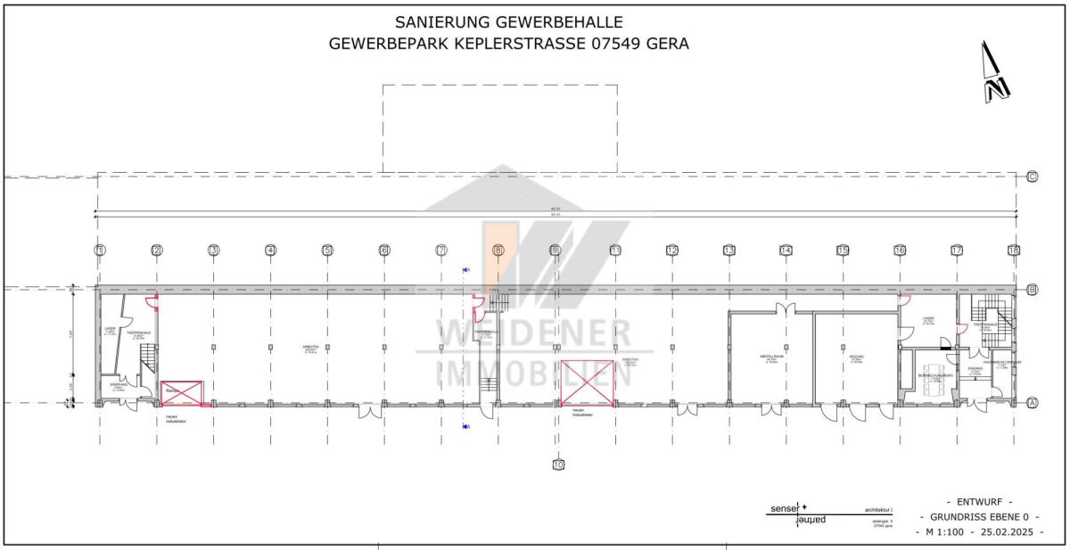 Die Halle wurde saniert bzw. renoviert. Er besteht aus verschiedenen Gebäudeteilen, darunter eine Gewerbehalle, Produktionshalle, Büros und Lagerflächen.