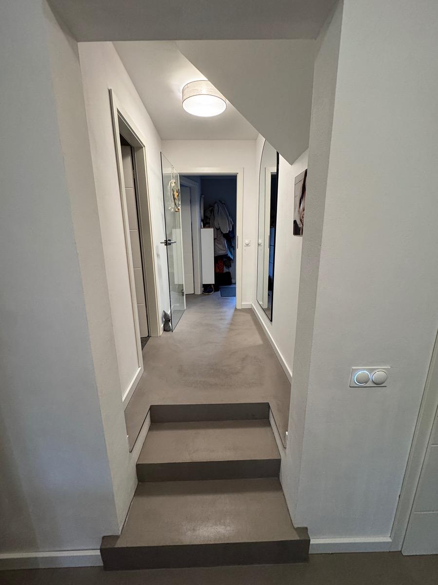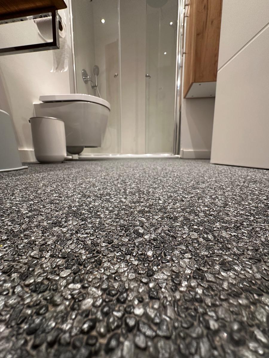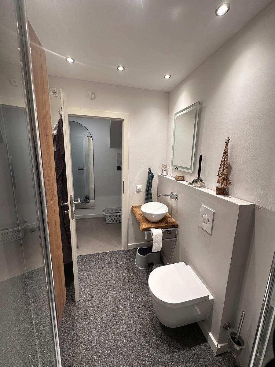 • ein modernes Gästebad mit fugenloser Betonoptik und Steinteppich