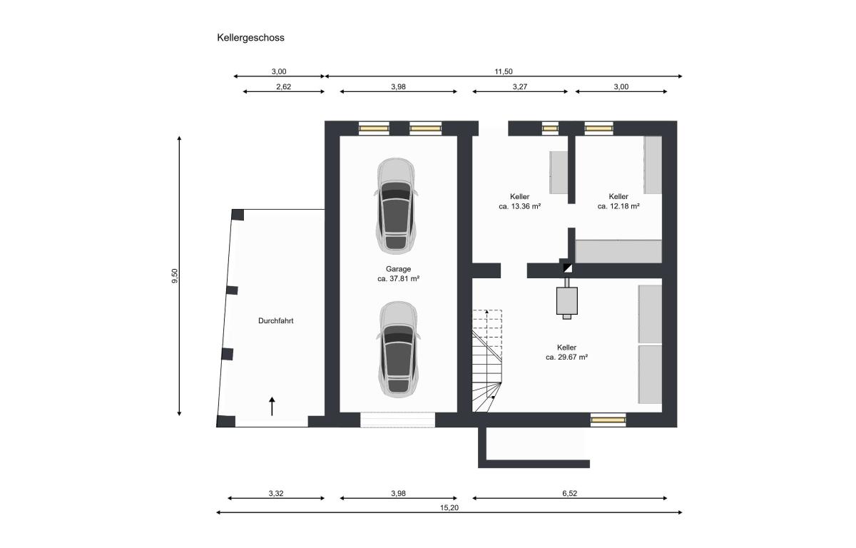 Darüber hinaus ist das Gebäude unterkellert und bietet ausreichend Stau- und Lagerfläche im Untergeschoss.