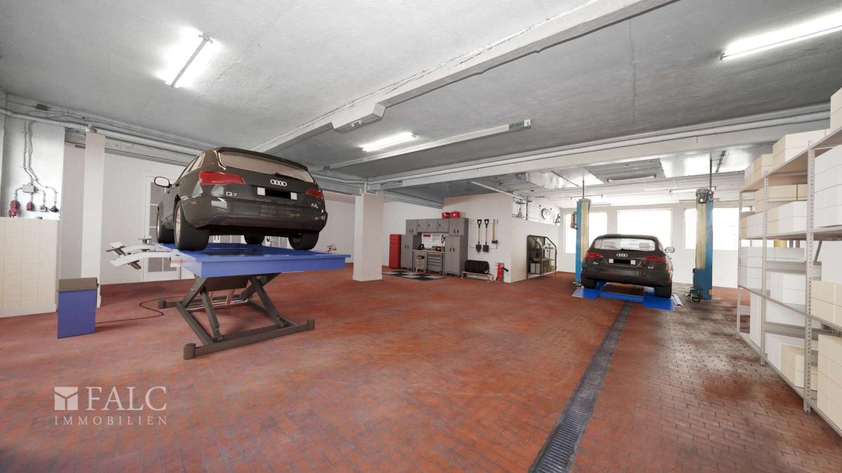 Das Erdgeschoss umfasst die Gewerbeeinheit mit circa 299 m² eine Werkstatt und eine Werkhalle für die Instandsetzung von PKW und den Reifenservice zur Verfügung, einen Pflegeraum und einen Waschplatz für Aufbereitungen. Auch an ein Lager und einen Empfang mit Verkaufsauslage wurde gedacht.