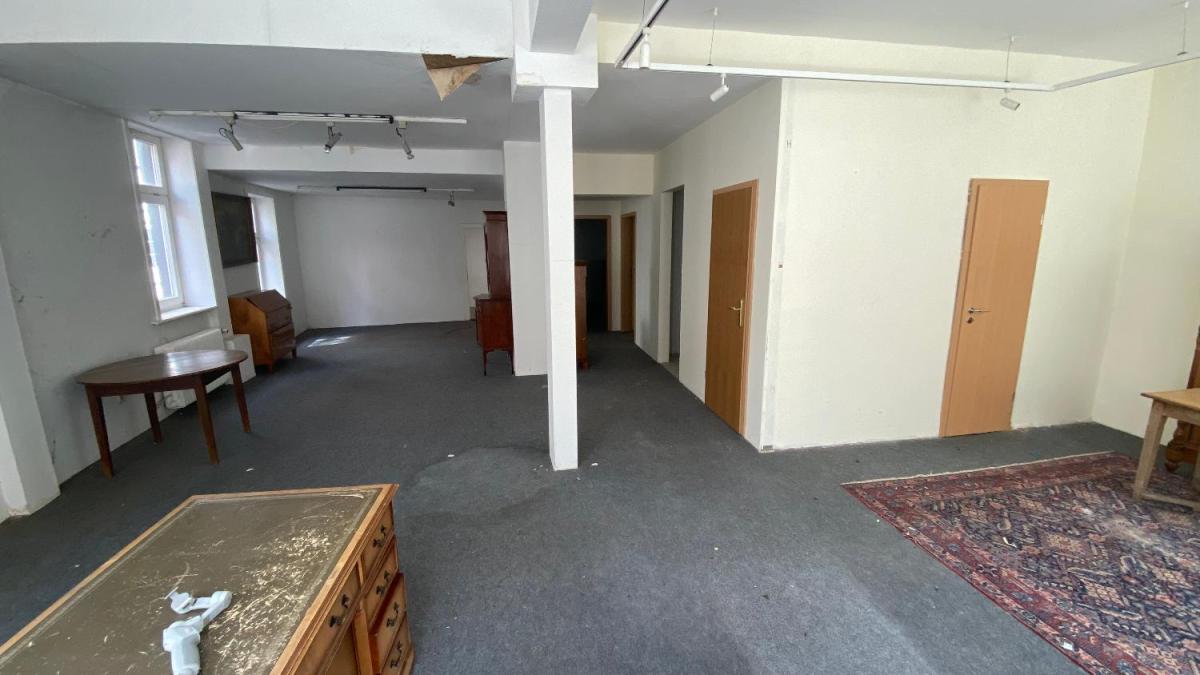 Die Einheit im Erdgeschoss wurde bisher gewerblich genutzt, bietet jedoch aufgrund der Raumaufteilung hervorragende Möglichkeiten für den Umbau zu einer großzügigen Wohnung. Aktuell unterteilt in Wohn- und Schlafzimmer, Küche, Bad sowie Abstellraum, kann sie alternativ problemlos weiterhin als Laden- oder Büroraum dienen – inklusive Lagerfläche und separatem Büro. Eine Renovierung, insbesondere die Fertigstellung des Sanitärbereichs, steht hier noch an. Wohnung im Obergeschoss mit Dachterrasse (ca. 80 m² auf zwei Ebenen)