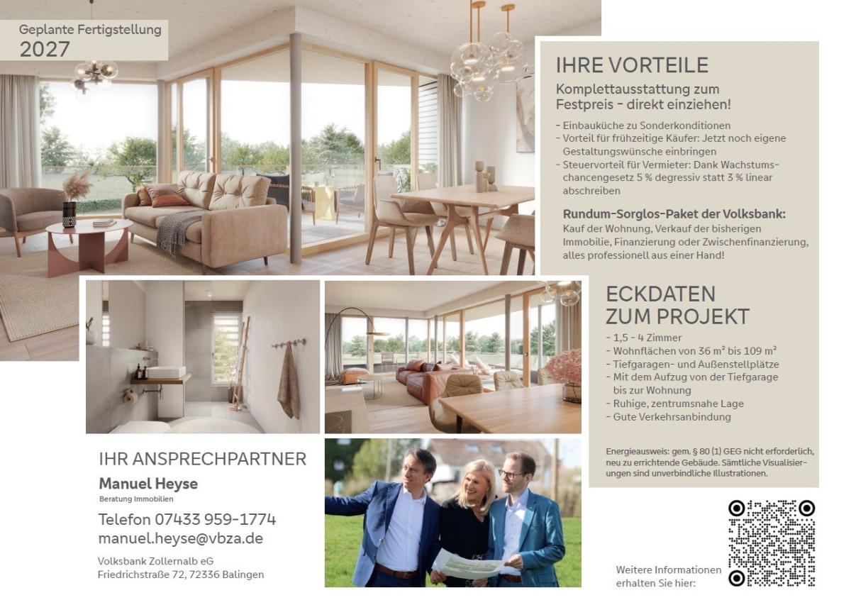 Die Informationen in diesem Exposé beruhen auf Angaben des Verkäufers. Wir haben diese im Rahmen unserer Möglichkeiten überprüft, eine Gewähr können wir nicht übernehmen. Die Kaufverhandlungen sind ausschließlich über uns zu führen. Die Grunderwerbsteuer, Notar- und Grundbuchkosten sind vom Käufer zu tragen. Unser Angebot ist vertraulich und freibleibend. Unser Angebot ist nur für den Empfänger bestimmt. Eine Weitergabe ist nur mit unserer Zustimmung erlaubt. Irrtum, Zwischenverkauf und Preisänderungen bleiben ausdrücklich vorbehalten. Rechtliche Ansprüche können nur aus dem Kaufvertrag, der Teilungserklärung mit der Bau und Ausstattungsbeschreibung sowie den amtlich genehmigten Bauplänen abgeleitet werden. Dieses Exposé dient zur Information und stellt kein vertragliches Angebot dar. Änderungen bleiben vorbehalten. Abbildungen sind Darstellungen aus Sicht des Illustrators. Erfüllungs- und Gerichtsstand ist, soweit gesetzlich zulässig, Balingen. Im Übrigen gelten unsere Allgemeinen Geschäftsbedingungen.