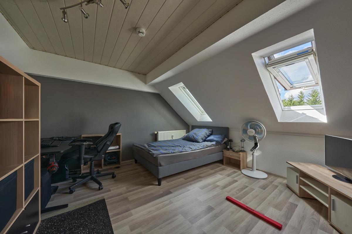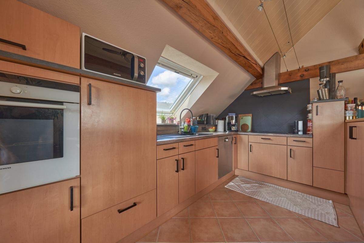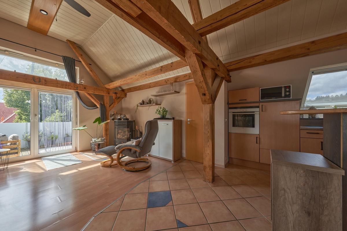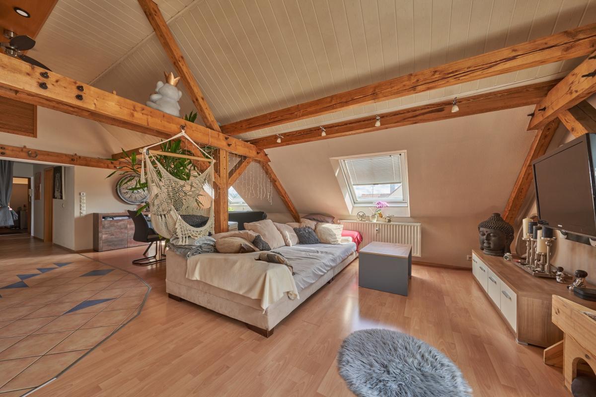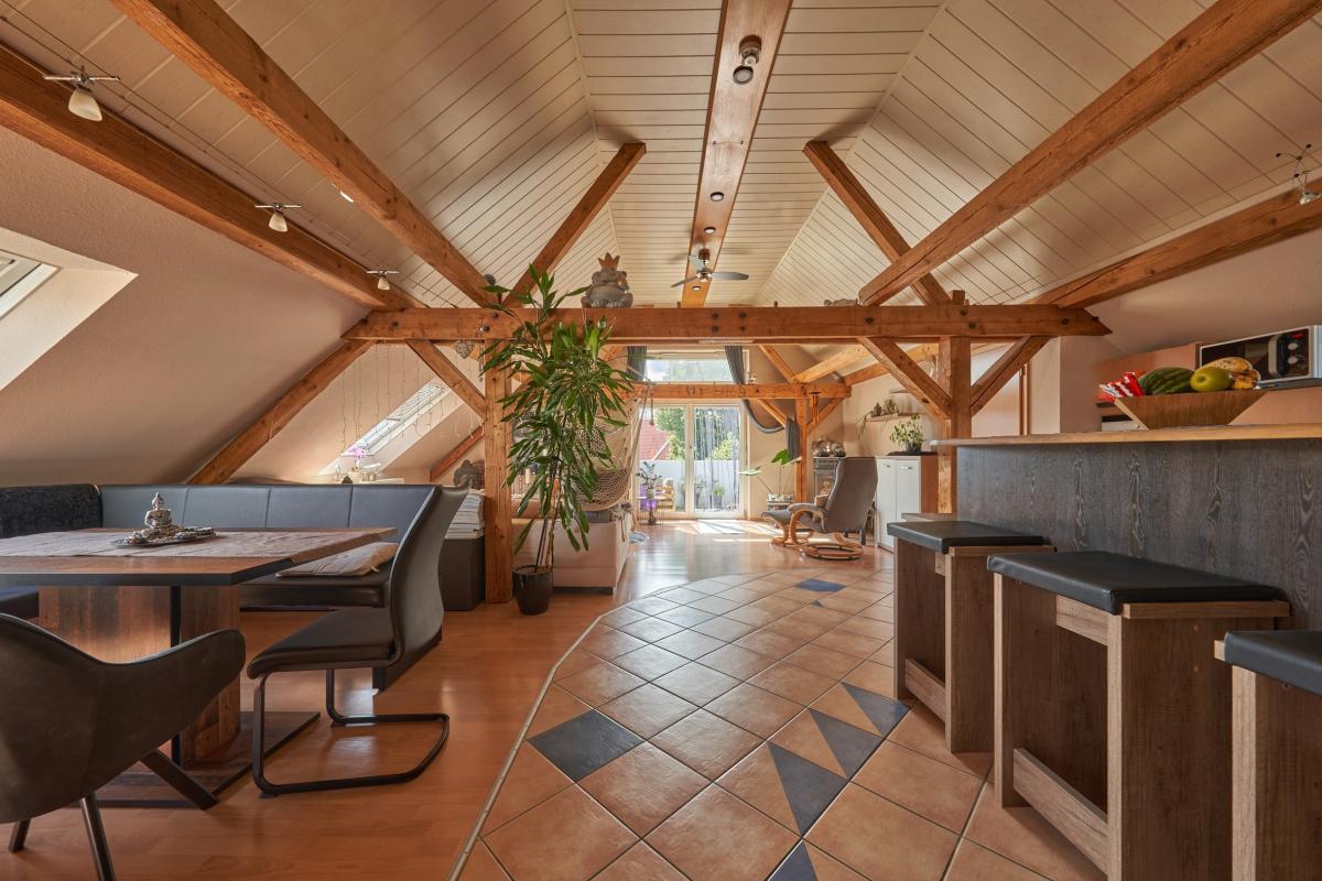 Die Wohnung verfügt über 4,5 Zimmer, darunter drei gemütliche Schlafzimmer und einen großen, bis in den Dachspitz hin offenen Wohn-, Ess und Kochbereich. Die Sichtbalken sorgen für ein behagliches Ambiente. Die Wohnung bietet zudem ein helles Tageslichtbad mit Badewanne und Dusche. Mit der bereits vorhandenen und im Preis enthaltenen Einbauküche, sind Sie für kulinarische Abenteuer bestens ausgestattet.