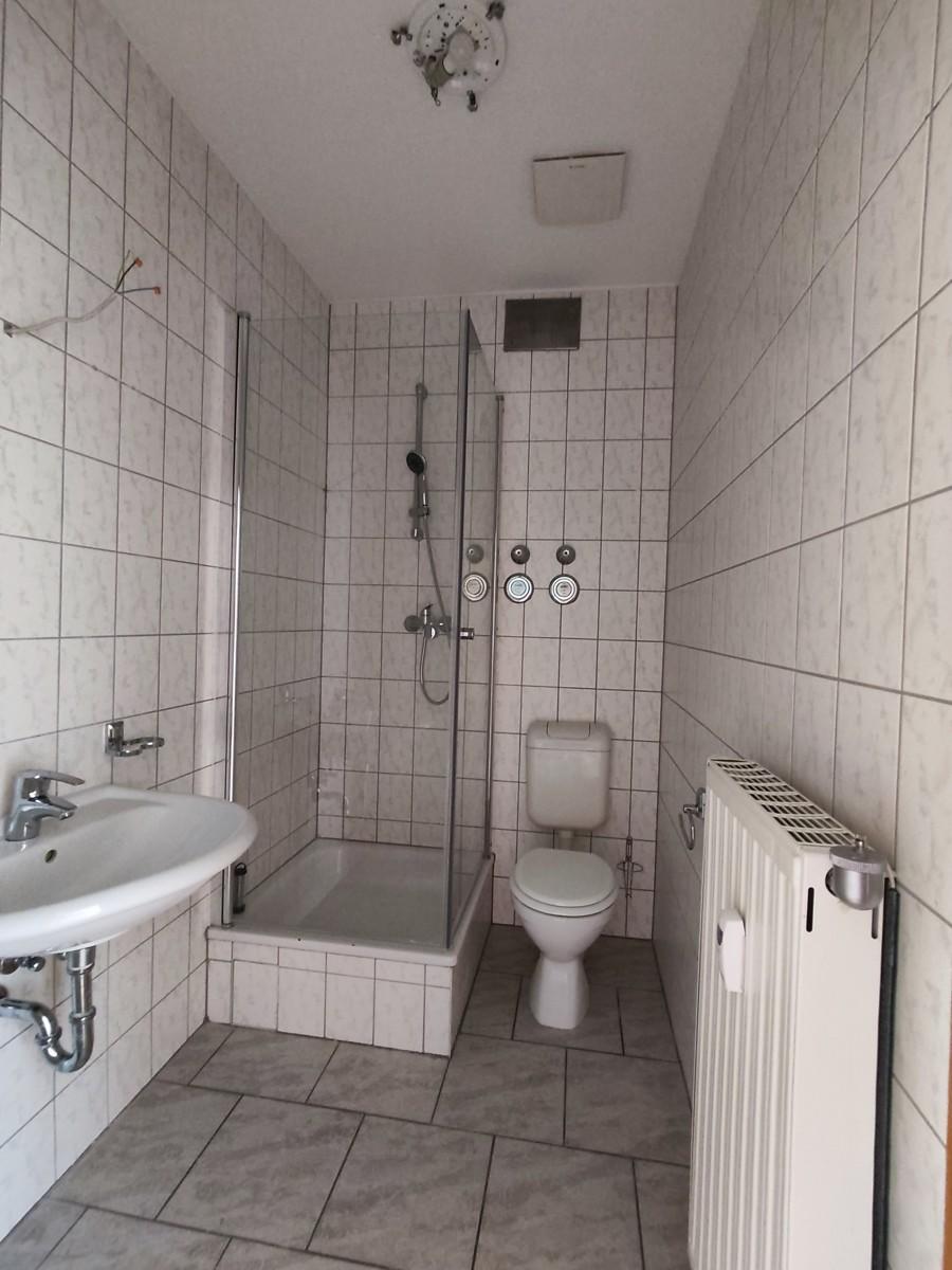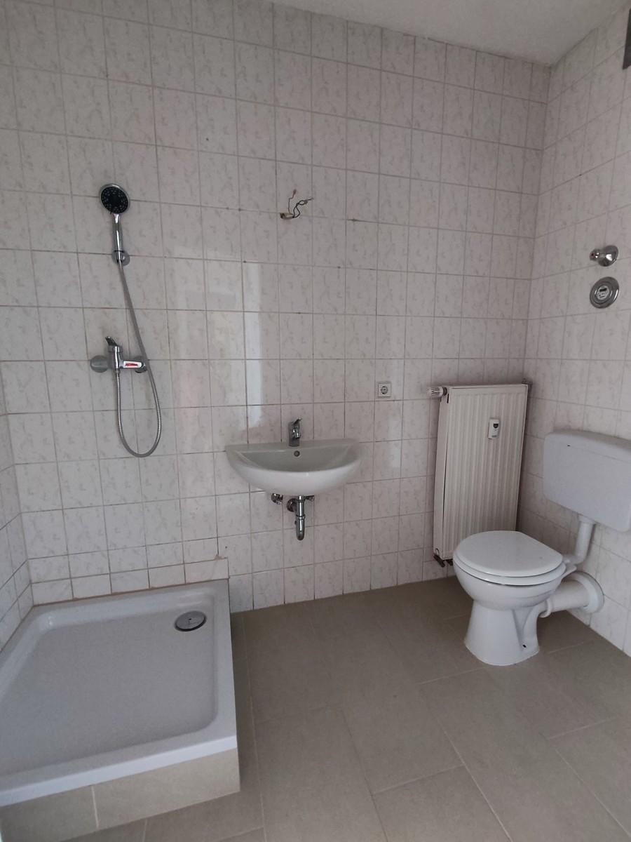 - 2 Bäder ohne Fenster, mit Dusche, WC, Waschbecken, Fußböden und Wände sind gefließt