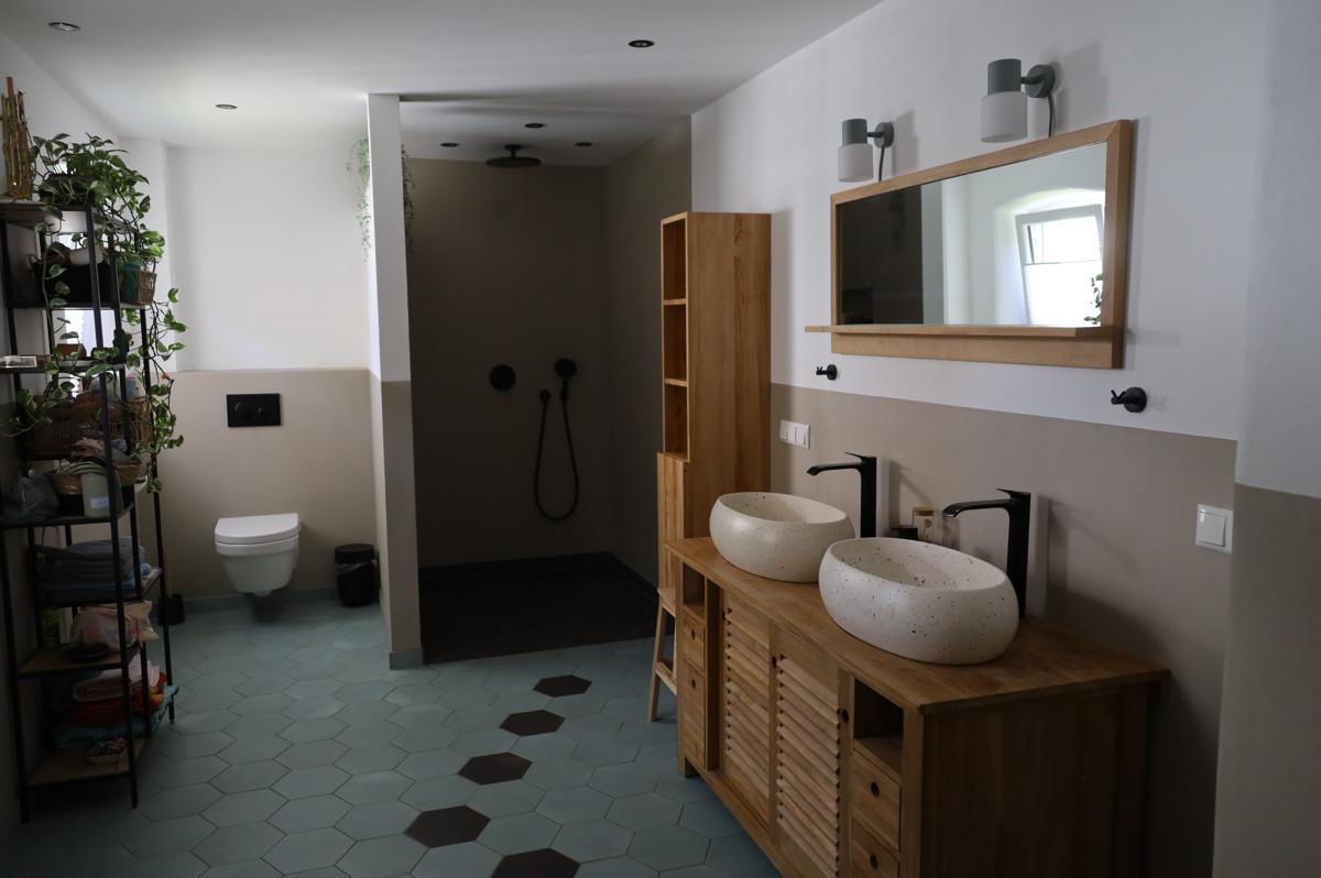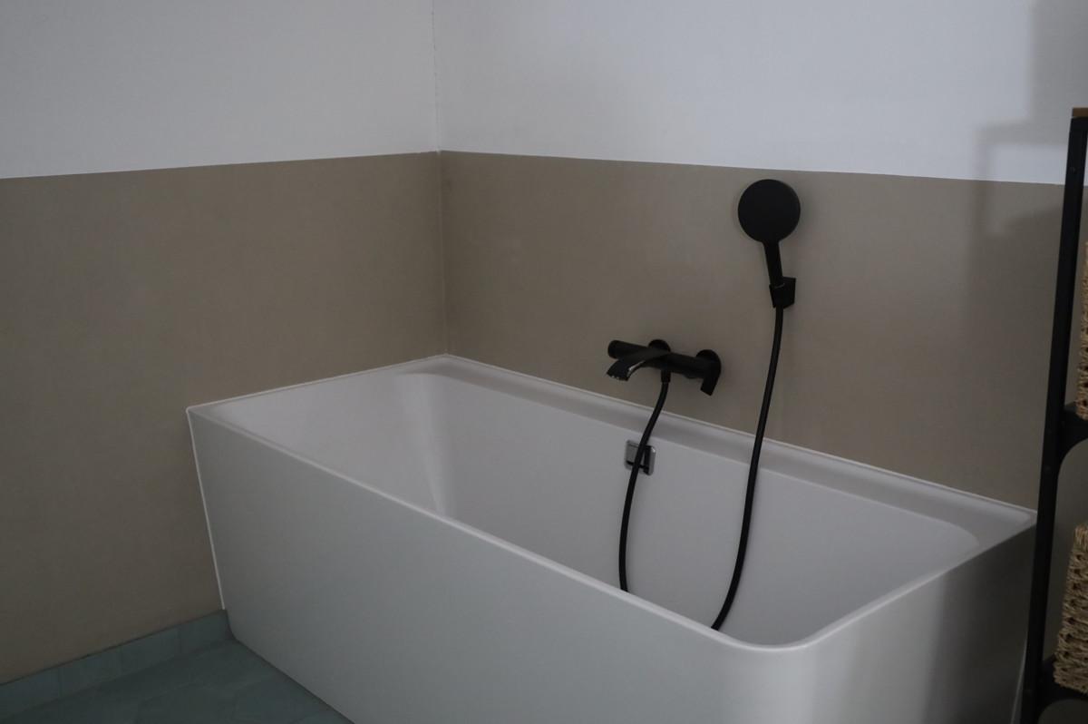 - Bad mit großer Badewanne und offener Regenwalddusche fugenlos, Fußbodenheizung