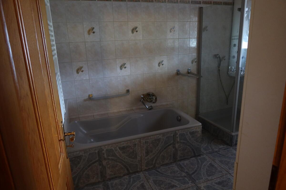 Schwedenofen im Wohnzimmer, Badfliesen terracotta, Wannen- und Duschbad,/WC, Balkon