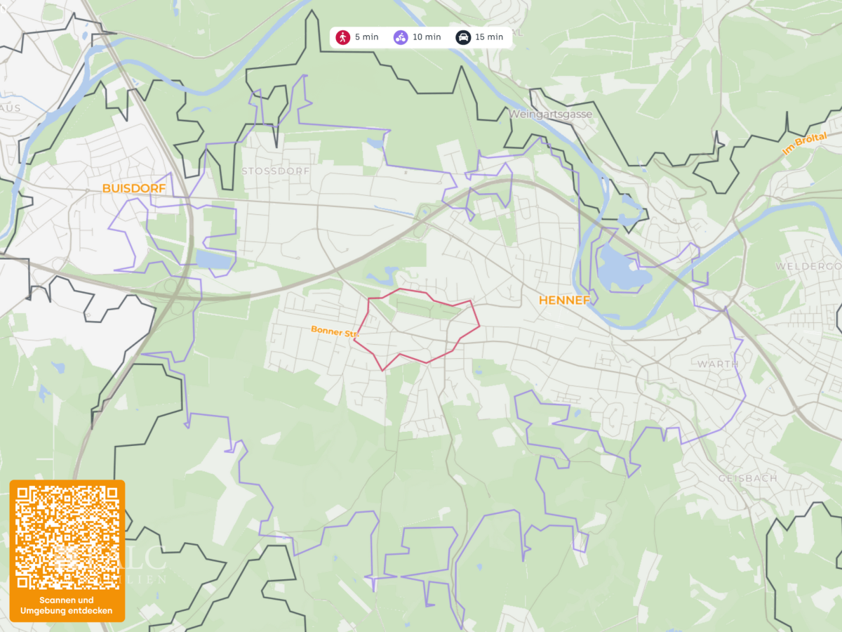 Die Immobilie befindet sich in einer ruhigen und dennoch zentralen Lage in Hennef (Sieg). Die Anbindung an den öffentlichen Nahverkehr ist hervorragend, mit mehreren Bushaltestellen in unmittelbarer Nähe, darunter die Haltestelle "Helenenstift" in nur wenigen Gehminuten erreichbar. Der Hennef Bahnhof ist ebenfalls in der Nähe und bietet eine schnelle Verbindung in die umliegenden Städte.