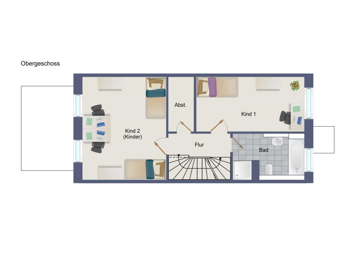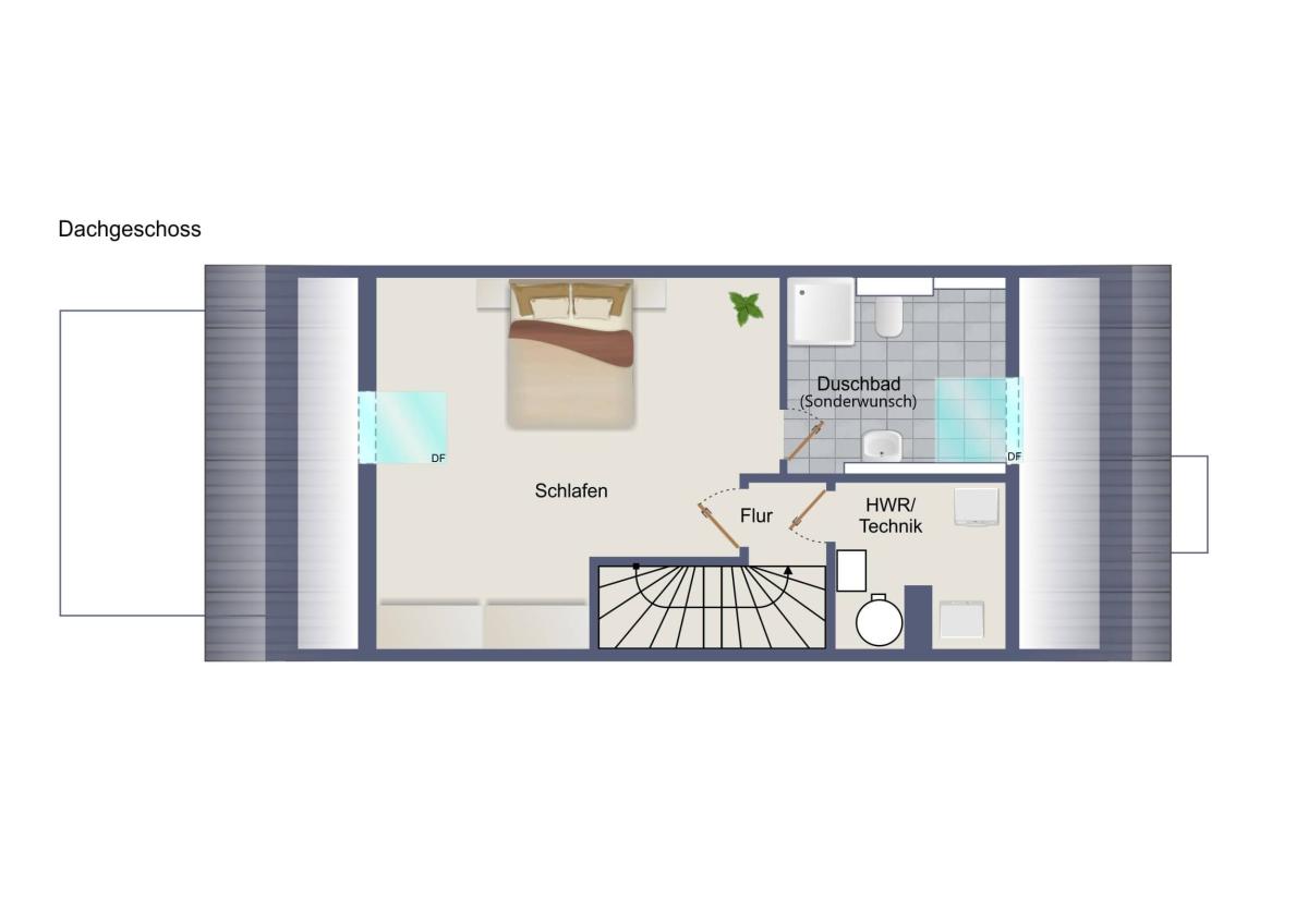 Die hier vorgestellte Einheit verfügt über ca. 126m² Wohnfläche, verteilt auf Erd-, Ober- und Dachgeschoss. Herzstück ist der offene Wohn- und Essbereich mit Zugang zur eigenen Terrasse. Im Erdgeschoss befindet sich zudem ein praktischer Abstellraum sowie ein WC. Das Obergeschoss ist mit zwei Schlafzimmern, Bad und Abstellraum das Reich der Kinder. Ihr Dachgeschoss beherbergt ein drittes Schlafzimmer und ein optionales Duschbad. Hier ist auch der Hauswirtschaftsraum untergebracht.