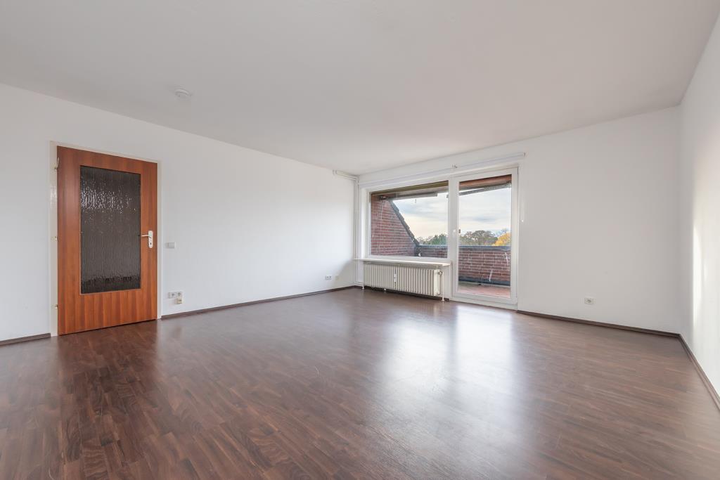 Rechter Hand der Diele befindet sich das geräumige Wohnzimmer mit Zugang zur Loggia. Hier lassen sich problemlos eine Sofalandschaft sowie ein Esstisch mit Platz für die ganze Familie unterbringen. Große Fensterelemente sorgen für angenehme Lichtverhältnisse. Die Loggia bietet aufgrund ihrer Lage im Dachgeschoss Privatsphäre und lädt zum Verweilen ein.