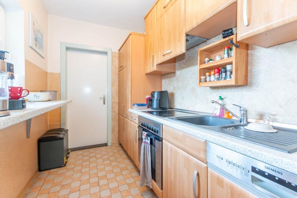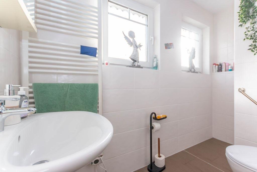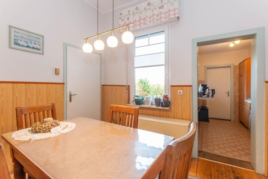 Weiter im Erdgeschoss befindet sich das Esszimmer, das durch seine Nähe zur Küche und einer angrenzenden Upkamer besticht – ideal als Büro oder kreativer Rückzugsort. Die Küche selbst ist funktional und bietet direkten Zugang zu einem kleineren Flur im hinteren Bereich des Hauses. Von dort erreichen Sie das modernisierte Badezimmer, das mit einer bodentiefen Dusche ausgestattet ist, sowie den Ausgang ins Freie. Ein praktischer Hauswirtschaftsraum rundet das Raumangebot im Erdgeschoss ab.