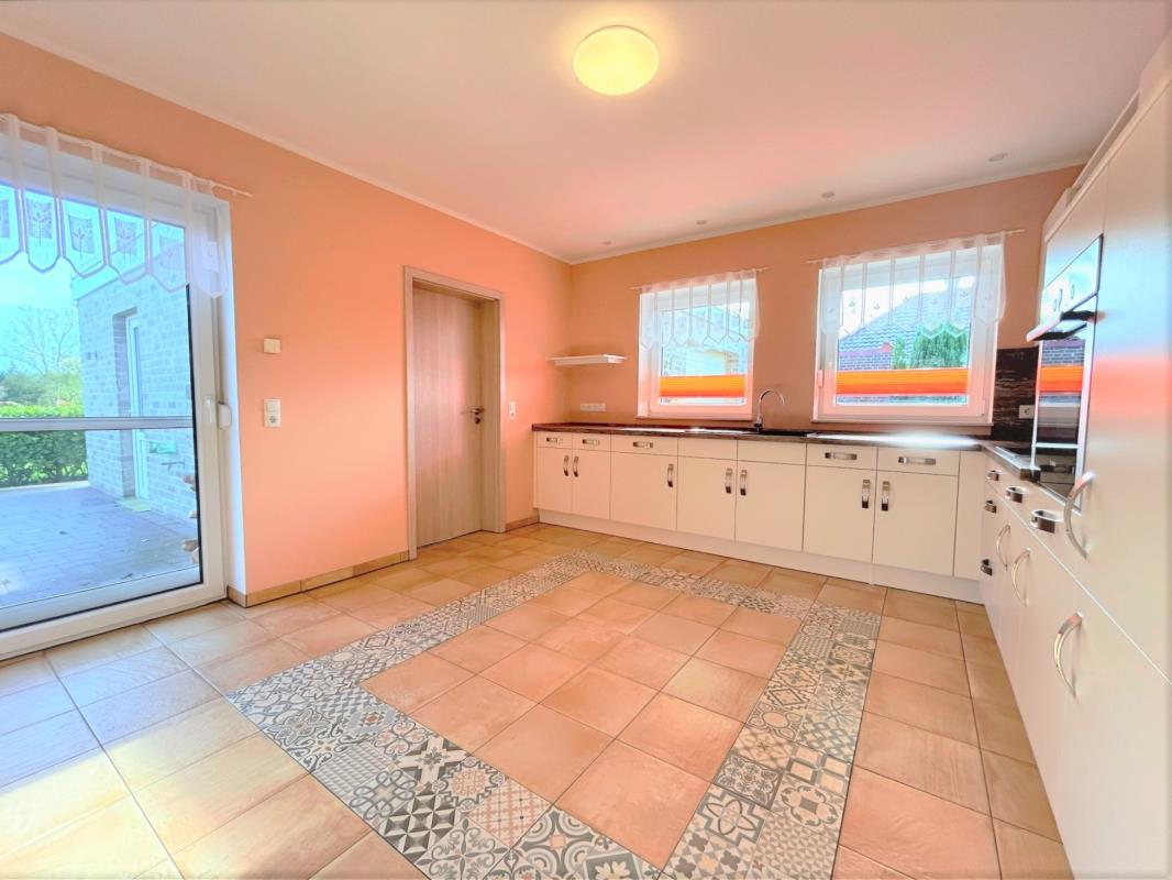Die großzügige Küche mit angrenzender Speisekammer und Hauswirtschaftsraum bietet kurze Wege. Der Hauswirtschaftsraum ist direkt mit der Garage verbunden, die mit einem elektrischen Sektionaltor ausgestattet ist – so gelangen Sie stets trockenen Fußes ins Haus.