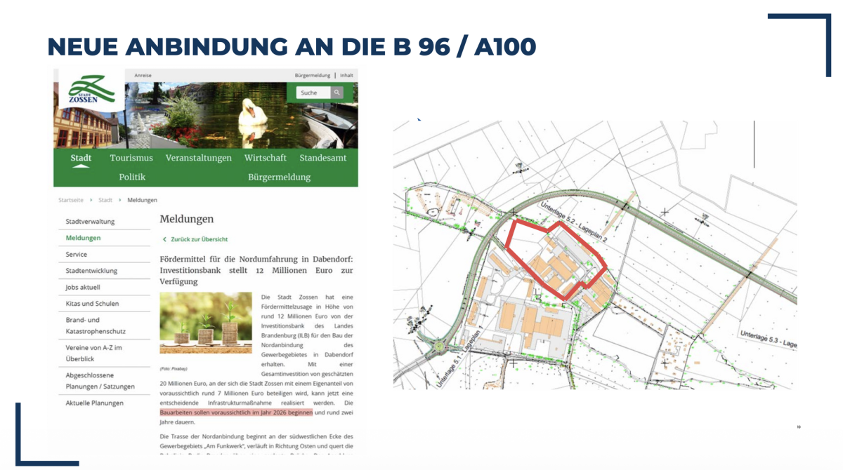 Zusätzlich ist eine weitere infrastrukturelle Verbesserung geplant: Im Zuge der Nordumfahrung ist eine neue Anbindung an die B 96 vorgesehen. Nach Auskunft der Stadt Zossen soll 2026 mit den Bauarbeiten begonnen werden. Dadurch reduziert sich die Fahrzeit vom Grundstück zur A 100 perspektivisch auf ca. 10 Minuten – ein klarer Standortvorteil und zusätzliche Zukunftssicherheit für Nutzer und Logistik.