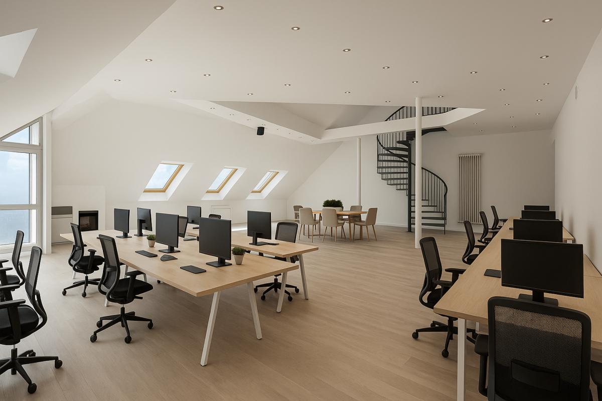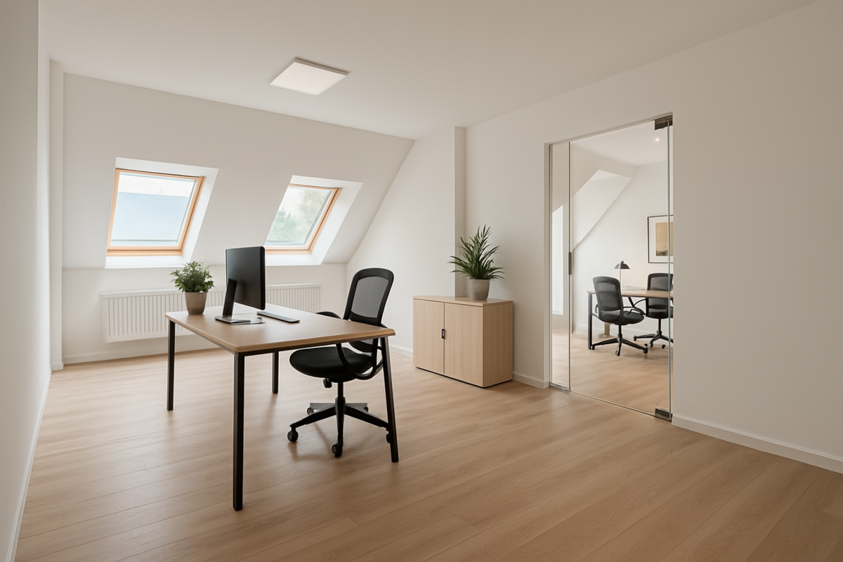 Die Raumaufteilung ist individuell anpassbar und ermöglicht sowohl Einzel- als auch Großraumbüros, separate Besprechungszonen oder offene Konzepte. Dank der Kombination aus Funktionalität und architektonischer Wirkung ist die Fläche sowohl für Unternehmen mit Kundenverkehr als auch für interne Nutzung bestens geeignet.