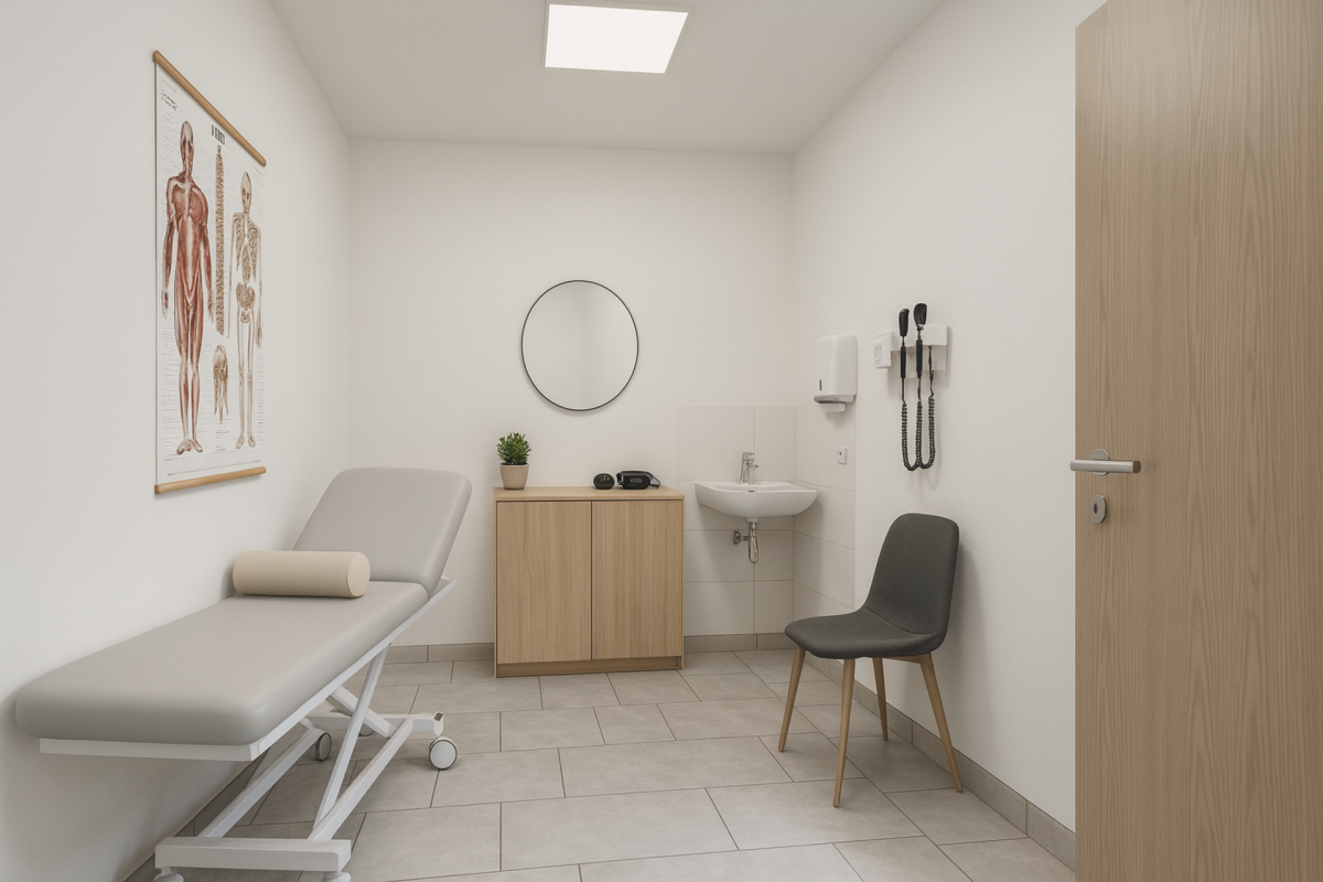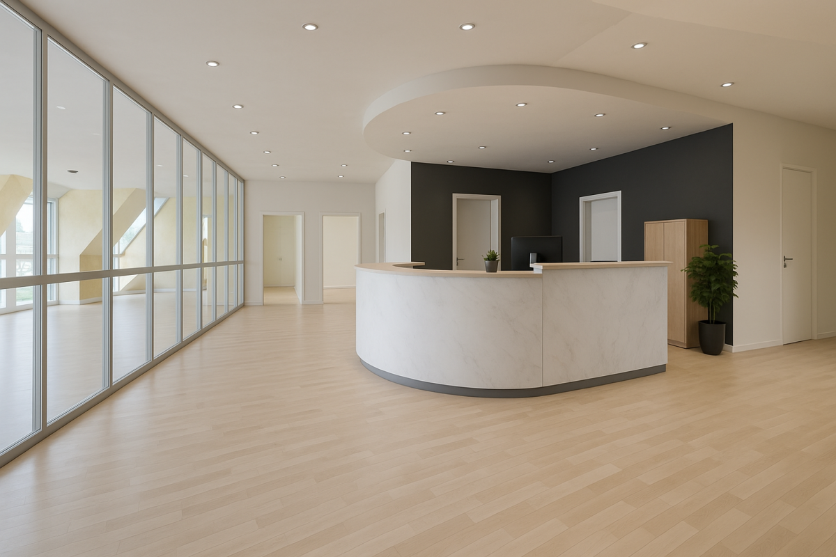 Ein besonderes Highlight ist der prachtvolle, lichtdurchflutete Eingangsbereich: Das großzügig verglaste Treppenhaus, das ins erste Obergeschoss führt, schafft eine eindrucksvolle Empfangssituation mit hoher architektonischer Qualität. Durch die zentrale Position der Treppe und die offene Anordnung der Räume rund um den Eingangsbereich eignet sich das Objekt ideal für ein Empfangskonzept mit Rezeption oder Wartebereich – mit Blickachsen in alle Richtungen. Diese Struktur ist insbesondere für größere Unternehmen, medizinische Versorgungszentren (MVZ), ein Ärztehaus oder auch hybride Konzepte aus Dienstleistung, Gesundheit und Verwaltung prädestiniert.