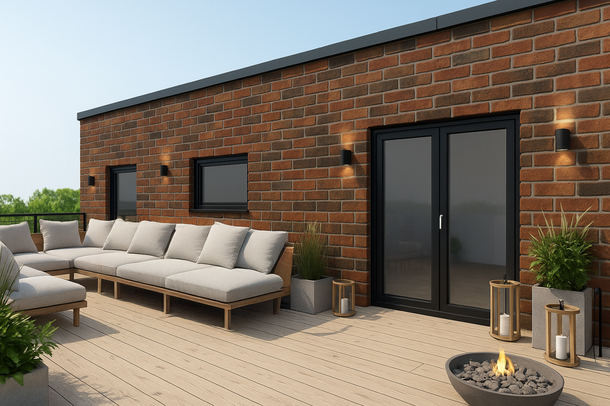 Ein modernes Farb- und Materialkonzept: Ein Mix aus klassisch graphitbuntem Klinker, anthrazitfarbenen Fassadenelementen und Fenster sorgen für ein modernes und zeitloses Erscheinungsbild.