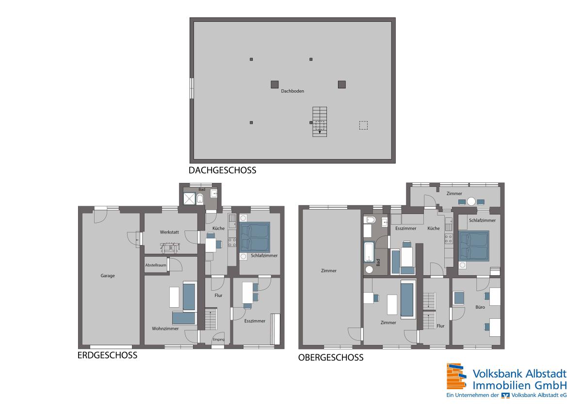 Im Obergeschoss steht Ihnen ein Schlafzimmer, zwei weitere Zimmer, eine Wohnküche mit Zugang zum Balkon, ein Badezimmer und eine bereits genehmigte Ausbaureserve mit ca. 30m² Wohnfläche zur Verfügung.