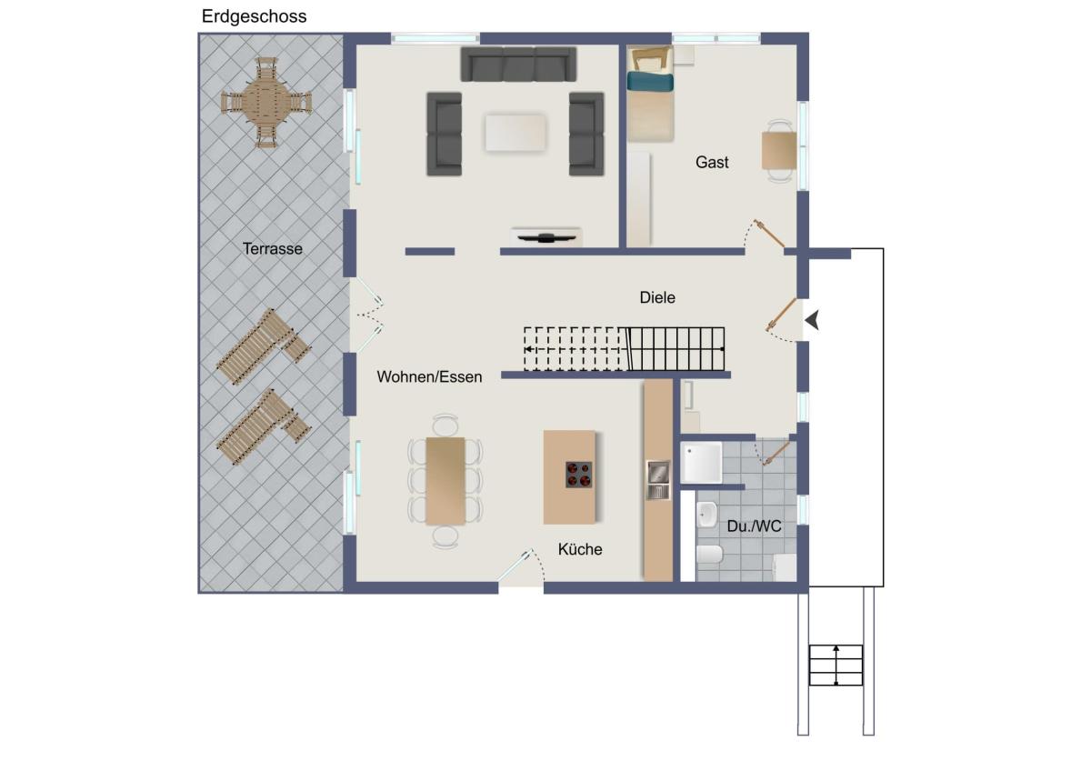 EG: Wohnen, Essen, Küche, Diele, Garderobe, Gäste Dusche und WC, Gästezimmer, große Terrasse