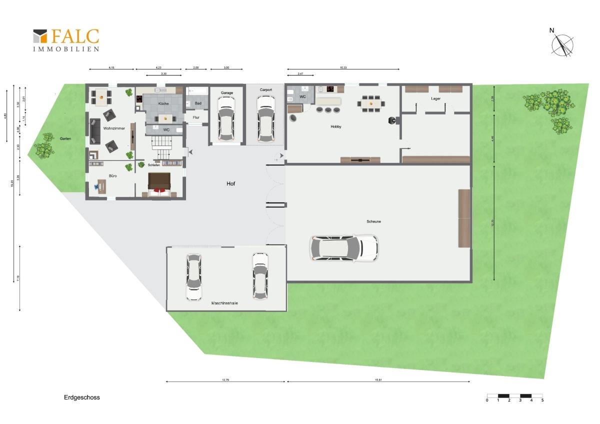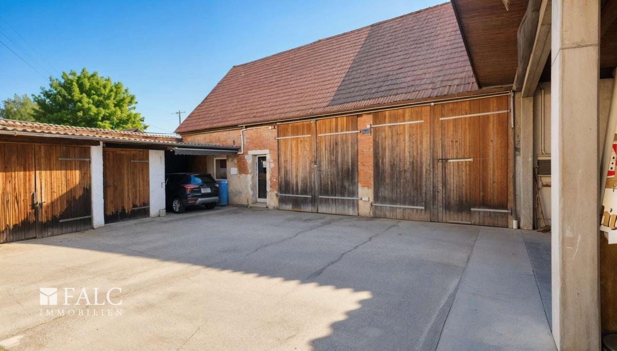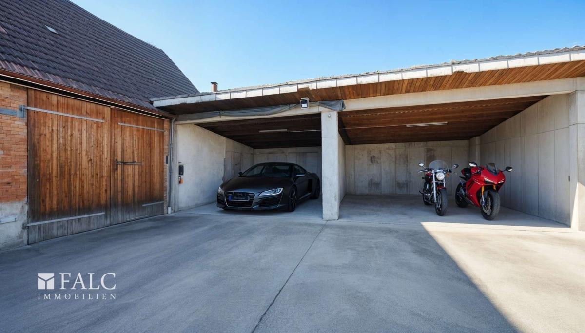 Zu diesem Anwesen gehört eine Garage, ein Carport, ein Fahrradschuppen, eine Scheune mit über 340 m² inklusive Hobbyraum und eine Maschinenhalle mit über 87 m², in deren Räumlichkeiten eine Werkstatt mit Hebebühne Platz finden könnte.