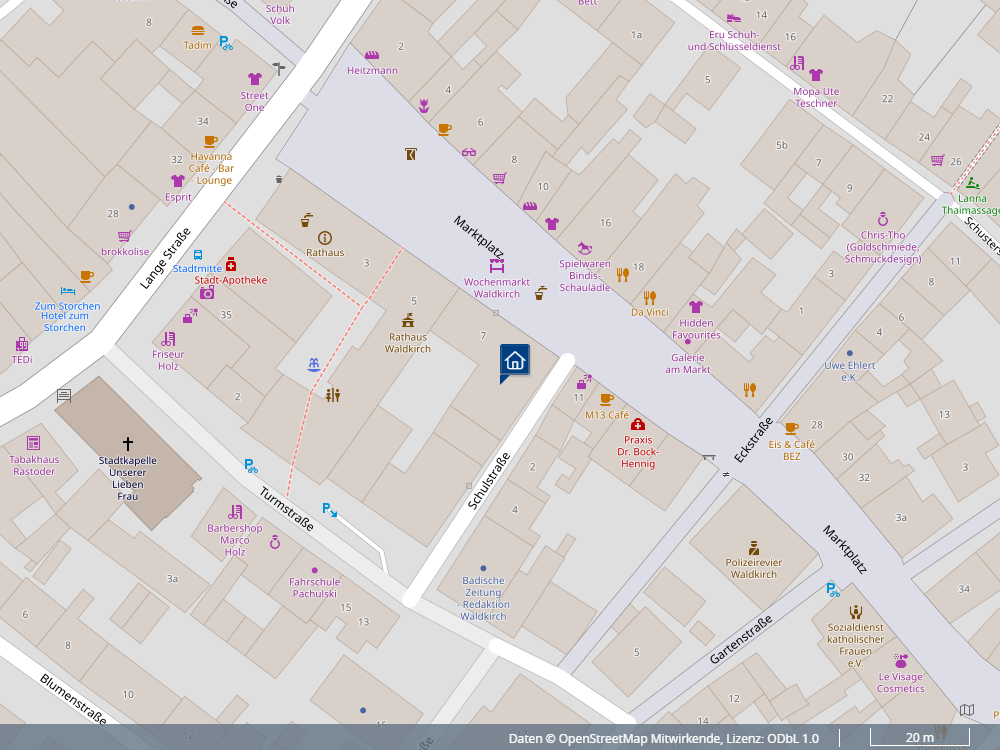 Im Erdgeschoss erwarten Sie zukünftig Räumlichkeiten der Stadtverwaltung Waldkirch und der Volksbank Breisgau Nord, jeweils mit Ausrichtung zum Marktplatz und den Straßen Schulstraße bzw. Turmstraße.