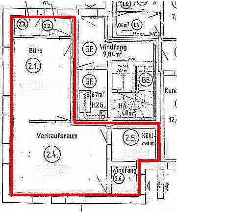 Die ebenerdige Einheit ist ausgestattet mit einem Verkaufsraum und einem weiteren Raum mit anschliessenden WC im hinteren Bereich. Dieser könnte als Vorbereitung/Küche,Lager oder Büro genutzt werden. Von dem zweiten Raum aus gelangt man durch das Treppenhaus ins freie.