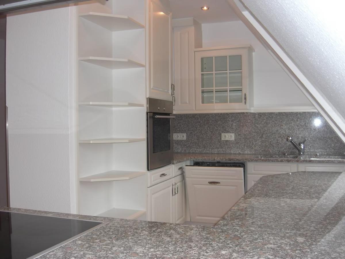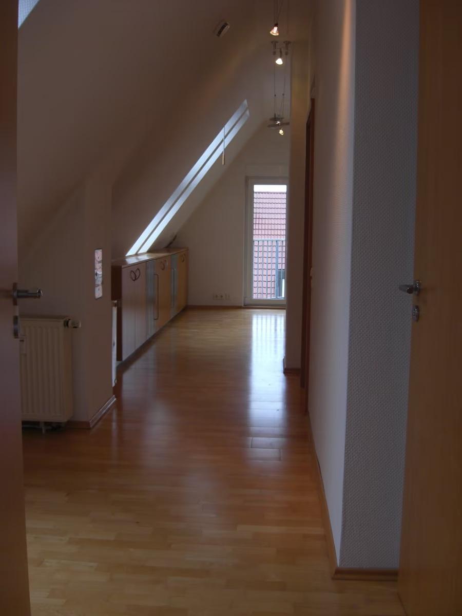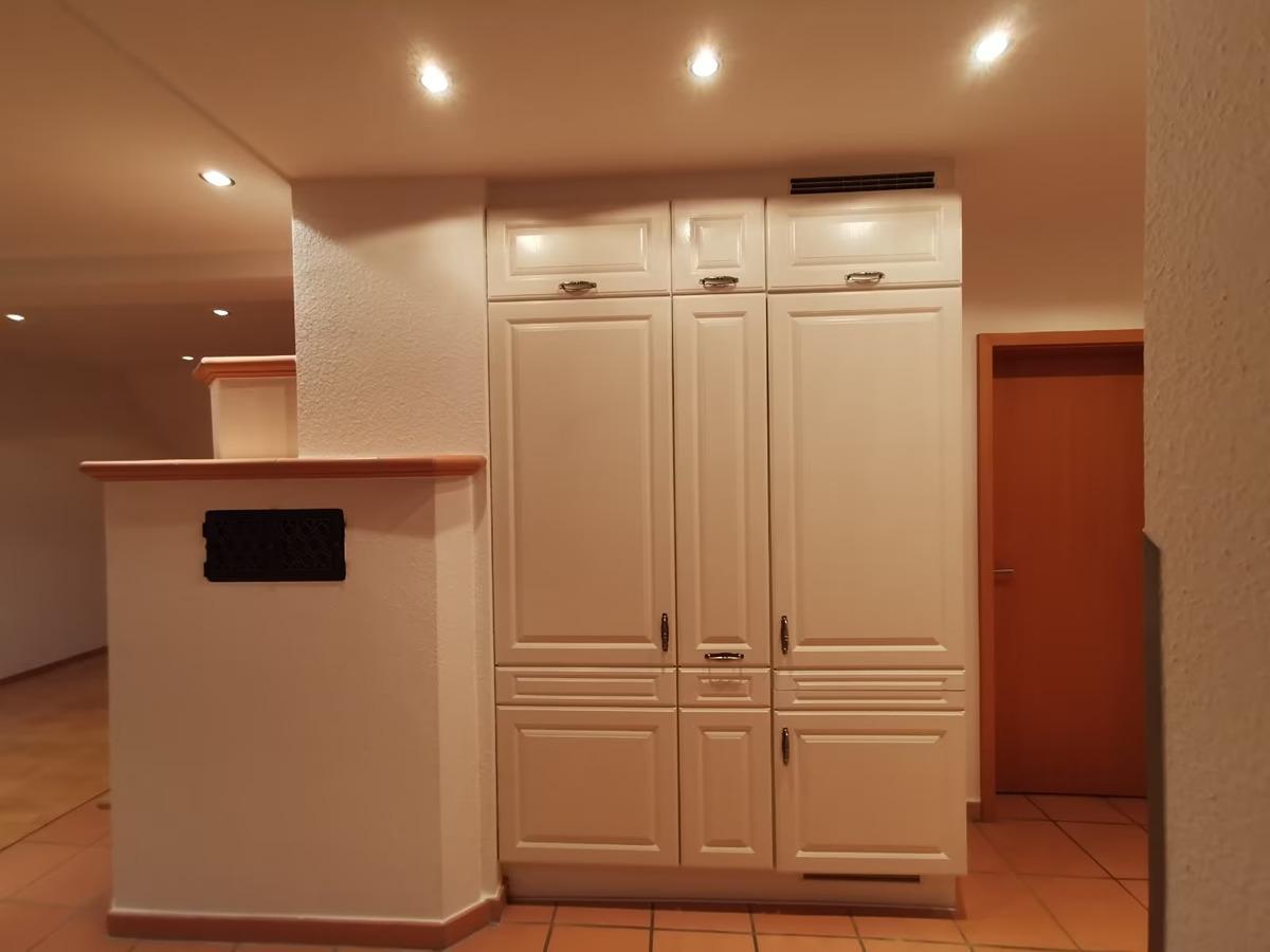 Buchenparkett in der gesamten Wohnung, Wohn- Esszimmer Kaminofen mit Fenstertüre mit Wärmespeicher und Terrakottafliesen, offene Küche mit Edelstahl Dunstabzug über Kochtresen mit hochwertigen Granitarbeitsplatten und Granitspiegel, Cerankochfeld (4 Platten), Edelstahlbackherd, Kühlschrank mit Gefrierfach. Küche mit vielen Apothekerschränken auch im Flur. Wannenbad/WC mit Marmorfliesen im 2 OG und Badregal, 2 Balkone (u.a. Granitplatten) im 2 OG, 1 Spitzbalkon im 3 OG, Duschbad/WC im 3 OG. Schlafzimmer mit vielen Einbauschränken, Panoramadachfenster und Ankleide im 3 OG. Weiße KunststoffDoppelisolierglasfenster, Rolladen, Flur mit vielen Apothekerschränken und Abstellraum. In der ganzen Wohnung Halogenseilsysteme, Halogeneinbaustahler, Sternenhimmel, Einbau Deckenlautsprecher. Vorhangseilsysteme. Keller ohne Einrichtung.