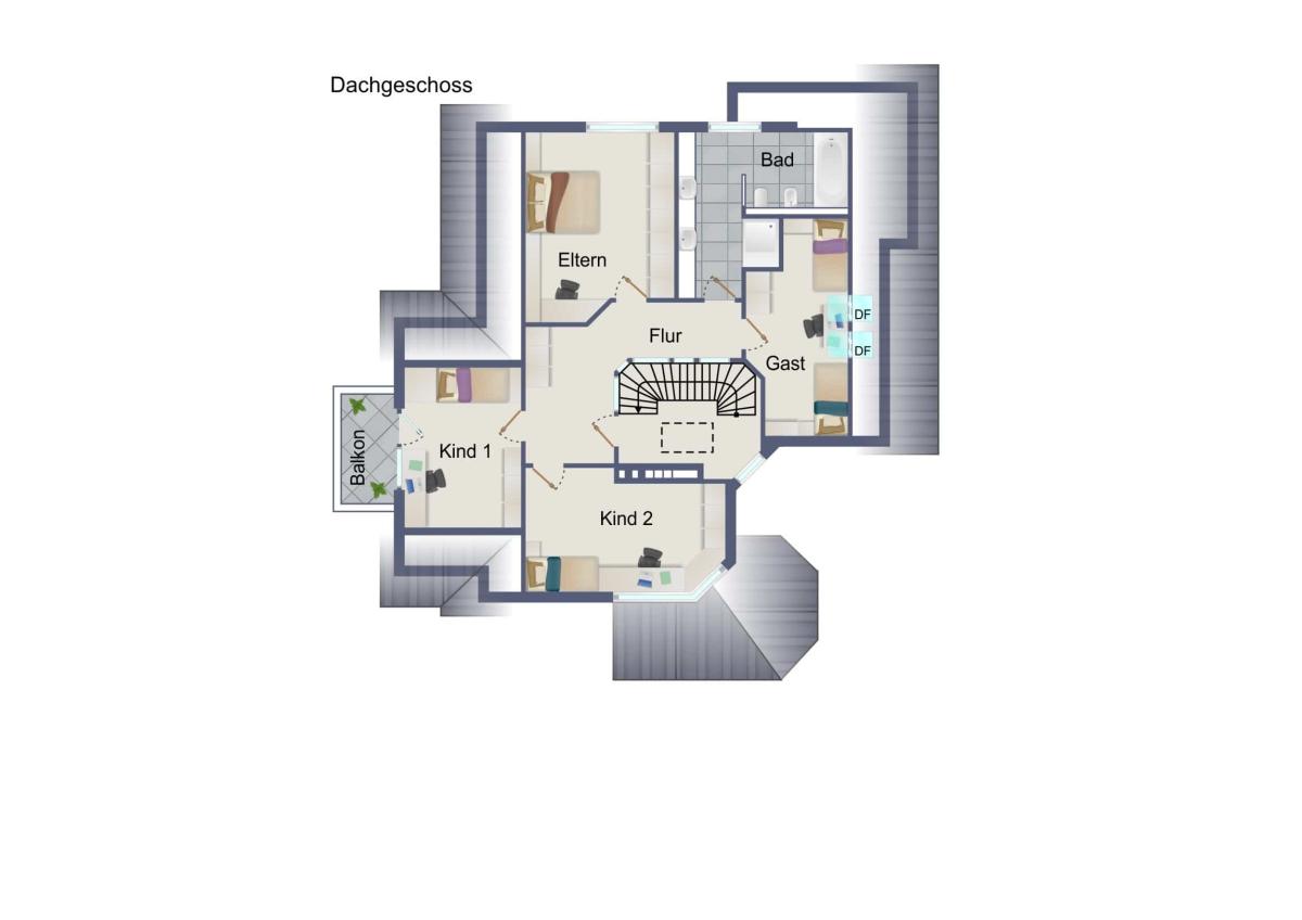 Die Hauptwohnung erstreckt sich über Erdgeschoss, Dachgeschoss und Kellergeschoss. Im Erdgeschoss befinden sich eine Diele, ein großzügiges Wohn- und Esszimmer, eine Küche, ein Wintergarten mit angrenzender Terrasse, ein Hauswirtschaftsraum sowie ein Gäste-WC. Das Dachgeschoss umfasst einen Flur, ein Elternschlafzimmer, drei weitere Zimmer, die sich ideal als Kinderzimmer, Büro oder Gästezimmer eignen, sowie ein Badezimmer. Im Kellergeschoss dieser Wohnung stehen ein Flur, ein Heizungsraum und zwei Abstellräume zur Verfügung.