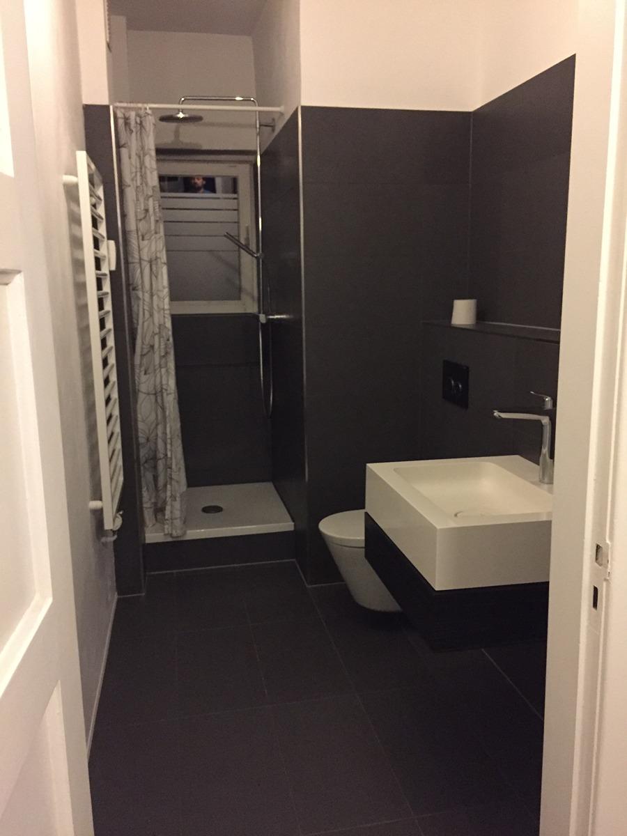 das Bad mit Dusche, modern gefliest (schwarze Fliesen),