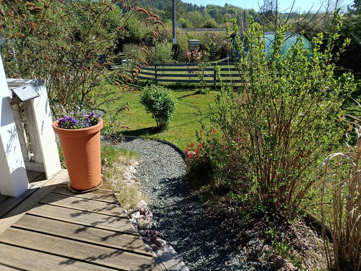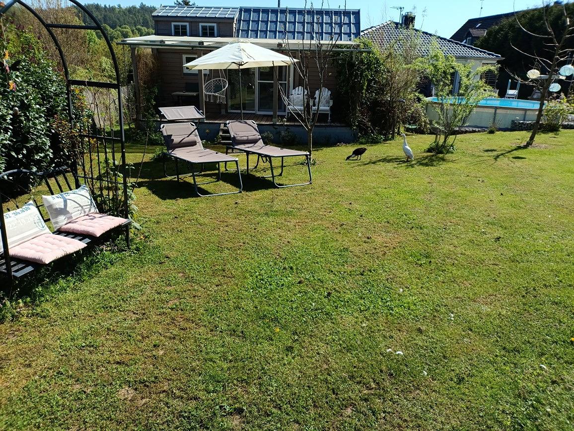 Hier erwartet Sie ein harmonisch gestalteter Garten mit verschiedenen Obstbäumen, Beerensträuchern, Naschgarten, und direktem Zugang zum Veldensteiner Forst – perfekt zum Waldbaden.