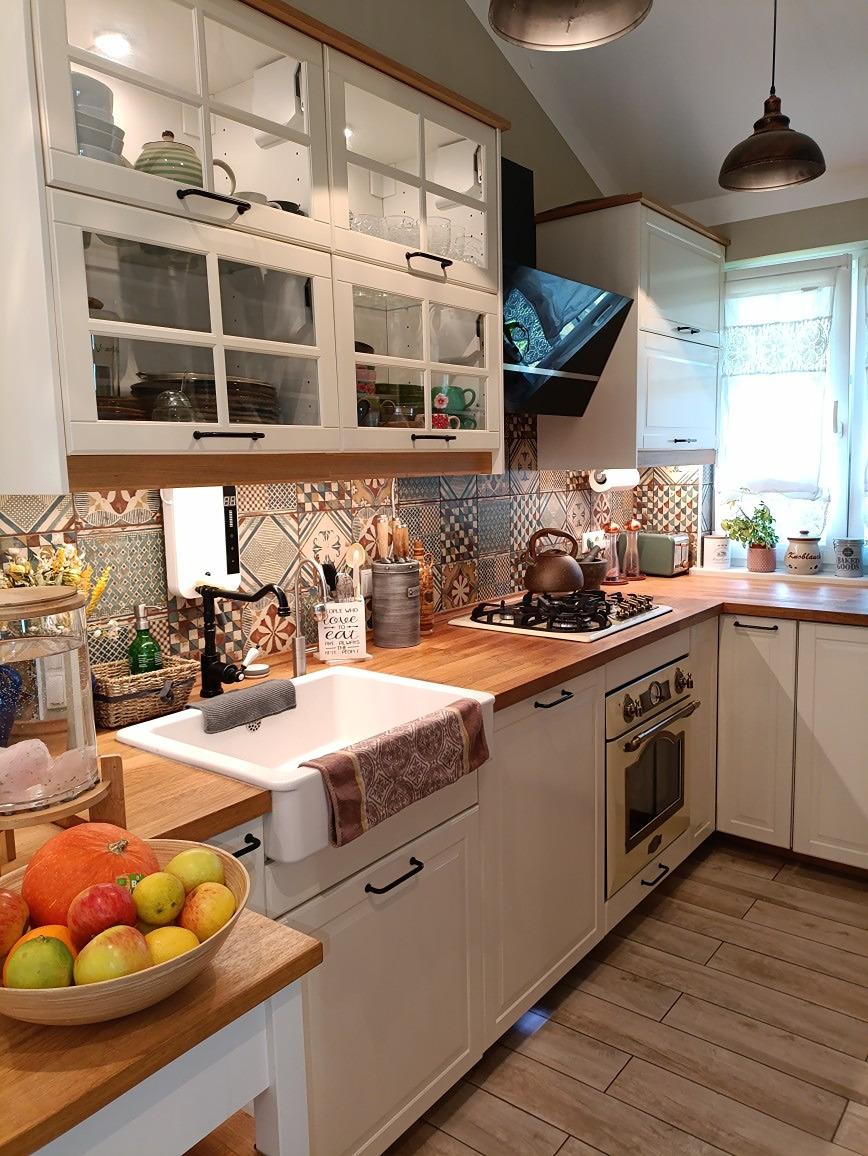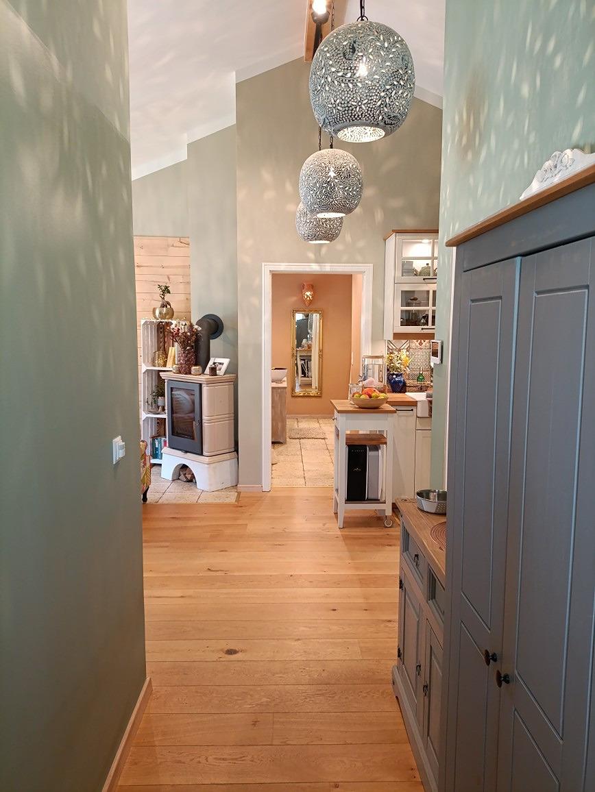 Die offene Landhausküche mit Vollholzarbeitsplatte und nostalgischem Gasherd fügt sich harmonisch in den Wohnraum ein – ein Ort, an dem Kochen und Zusammensein zu einem Erlebnis werden.