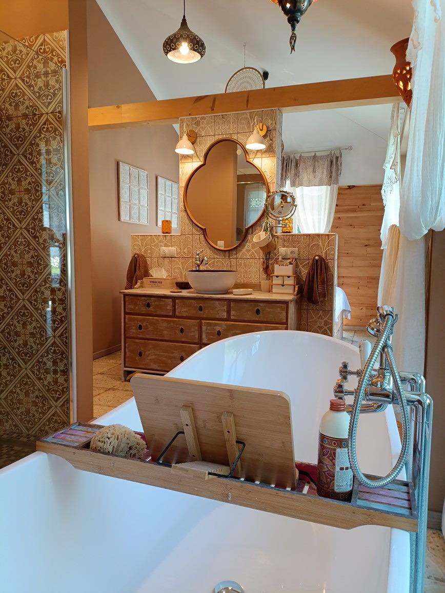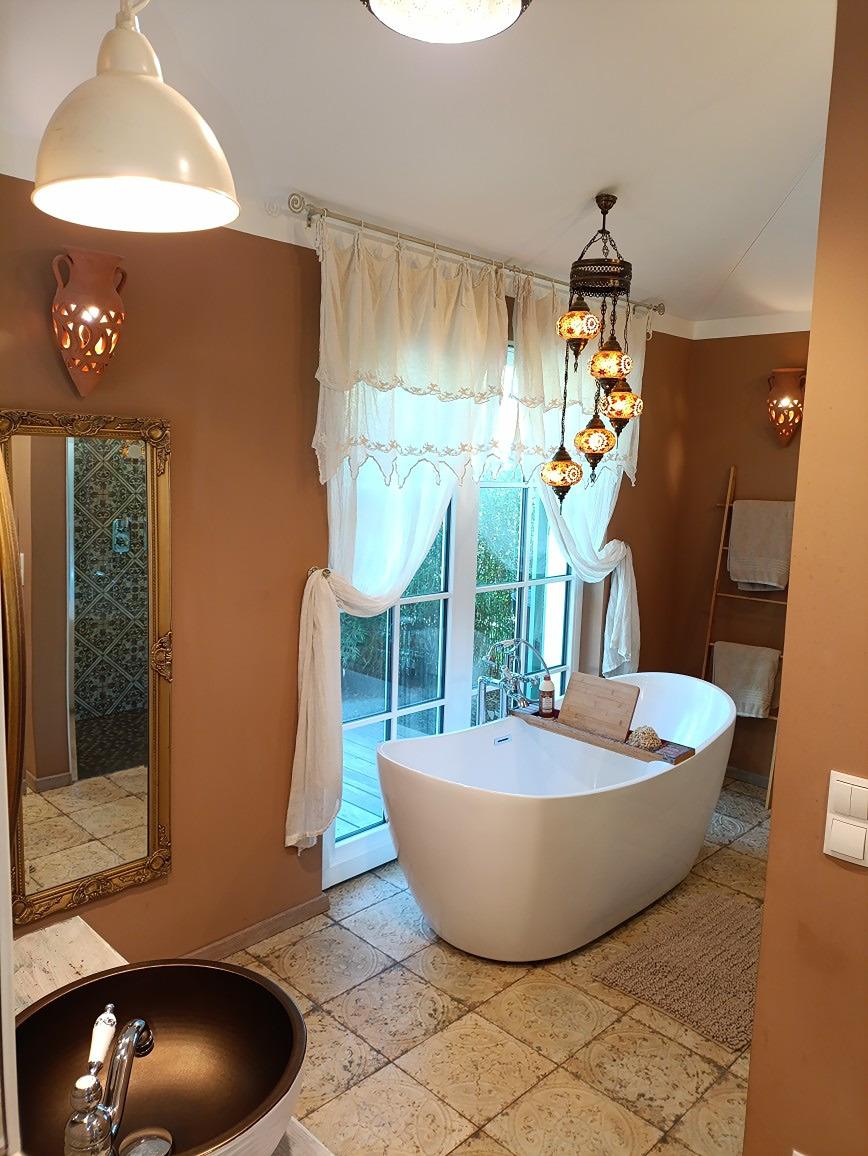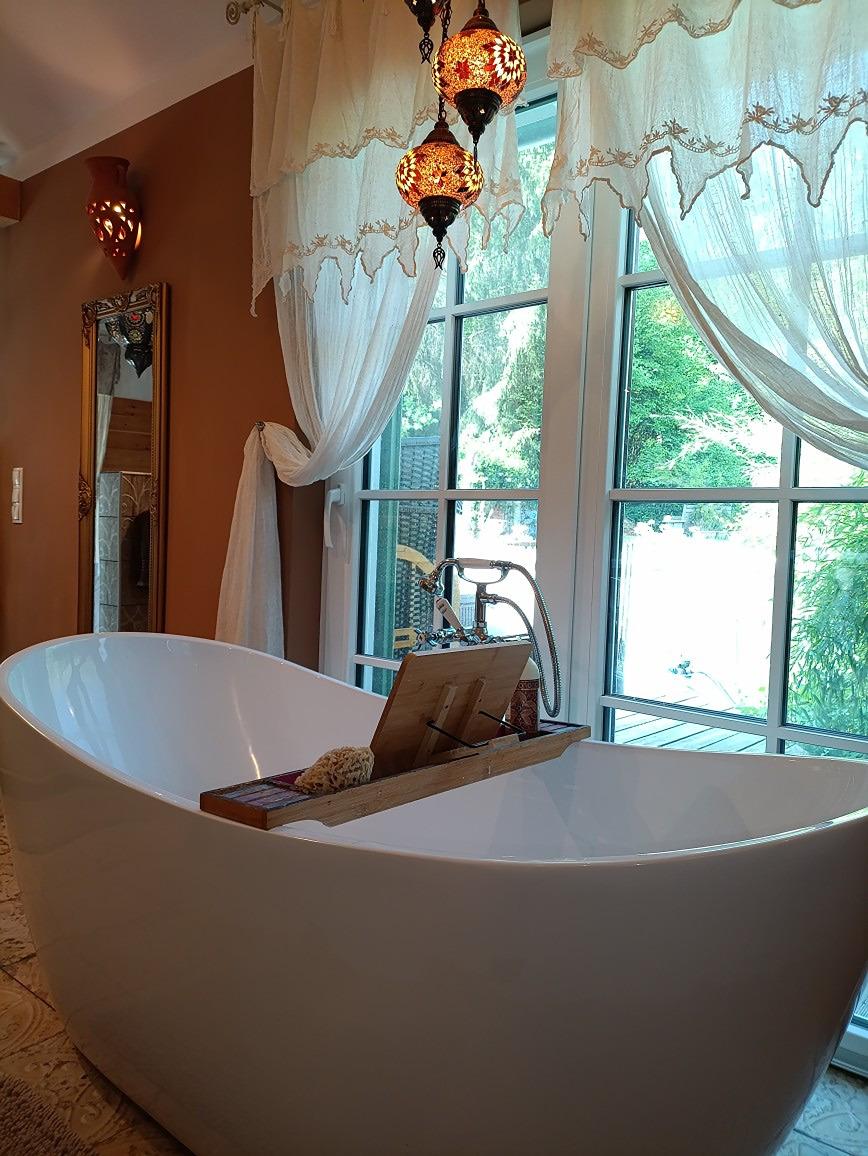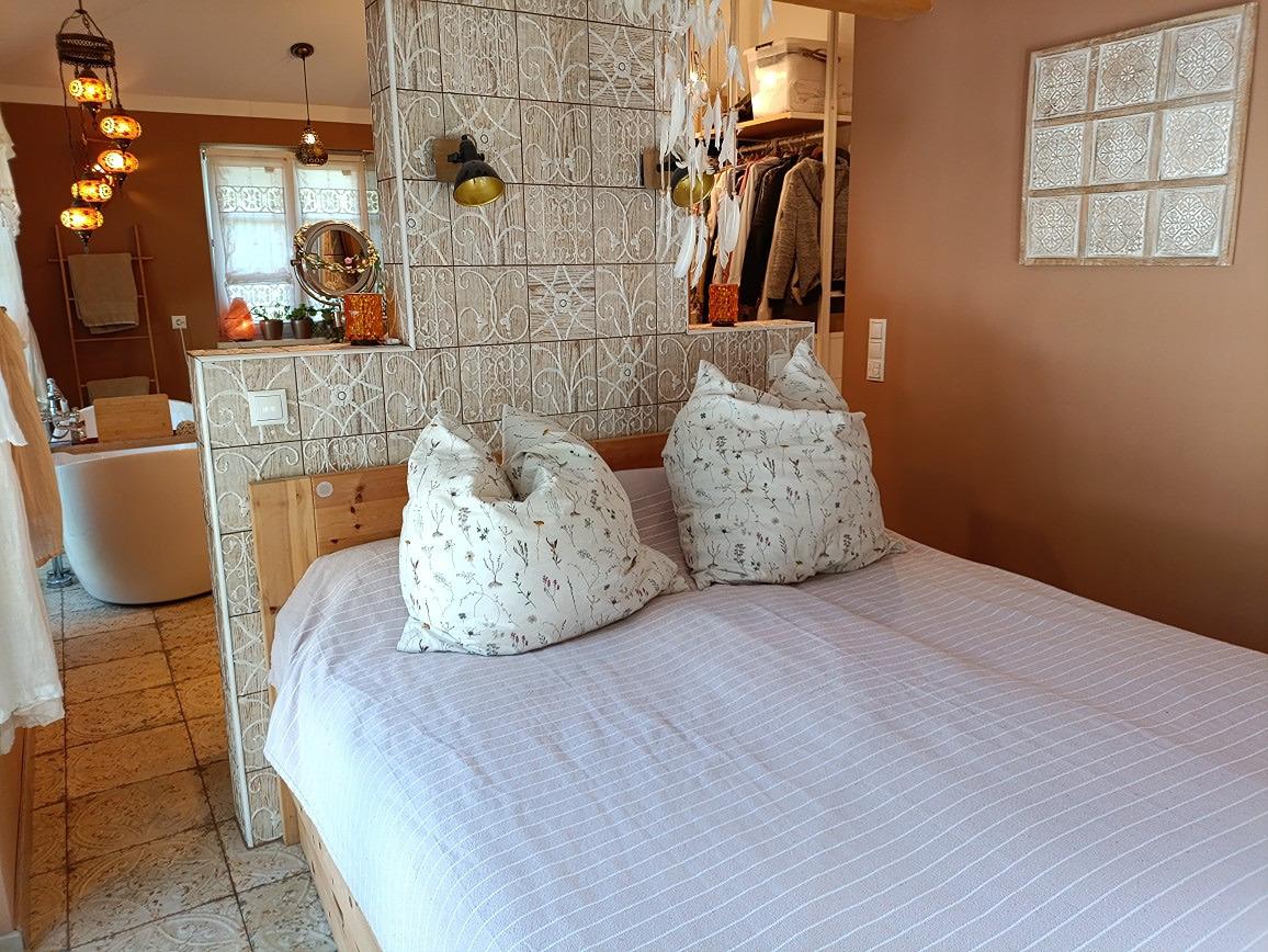 Das Schlafzimmer ist offen gestaltet und geht über in ein traumhaftes Masterbad mit freistehender Badewanne, Blick in den Bambusgarten, ebenerdiger Regendusche mit Echtglaswand und orientalischem Mosaik – eine ganz private Wellnessoase.