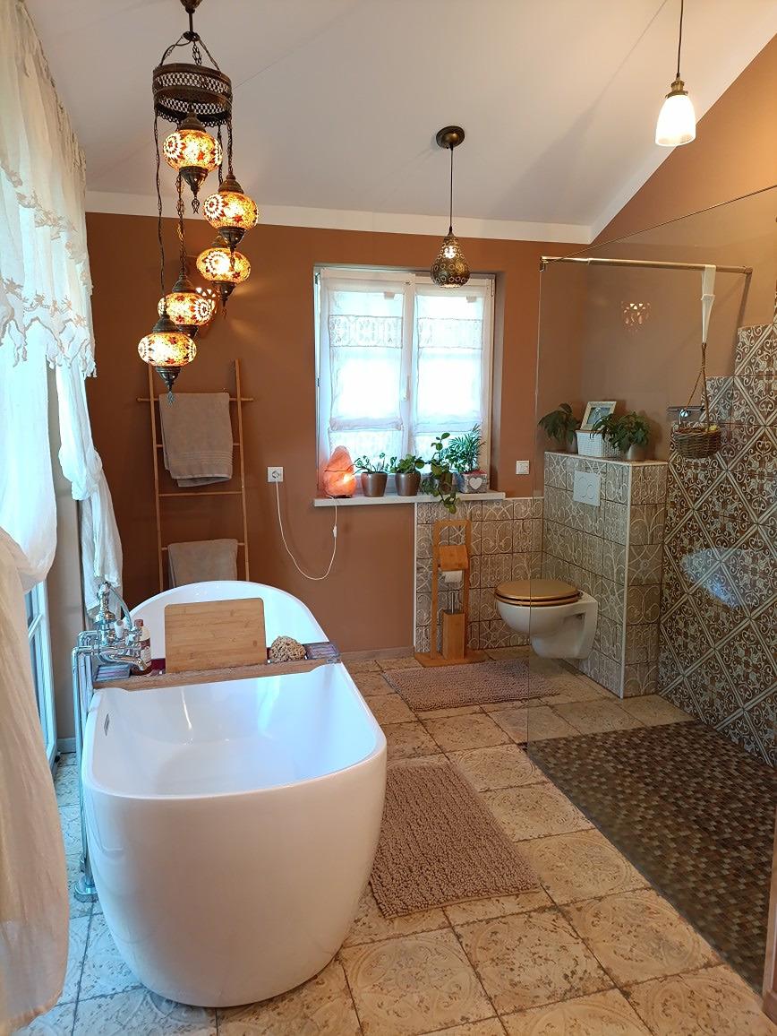 eine voll ausgestattete Landhausküche, ein Bad mit Flusssteinfliesen, ebenerdiger Dusche und nostalgischem Waschbecken,