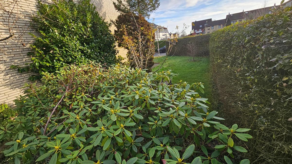 - Gepflegter Garten mit Rasen, Blumen und Zierpflanzen