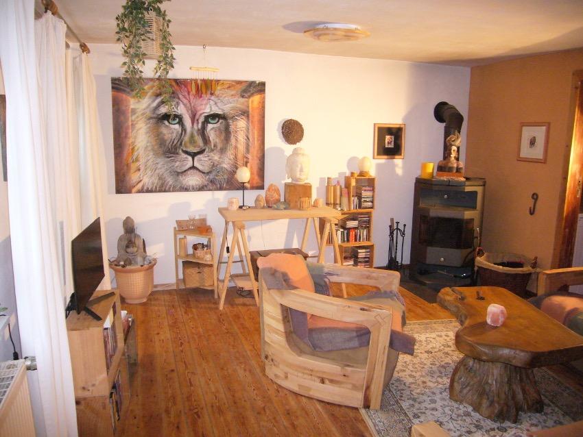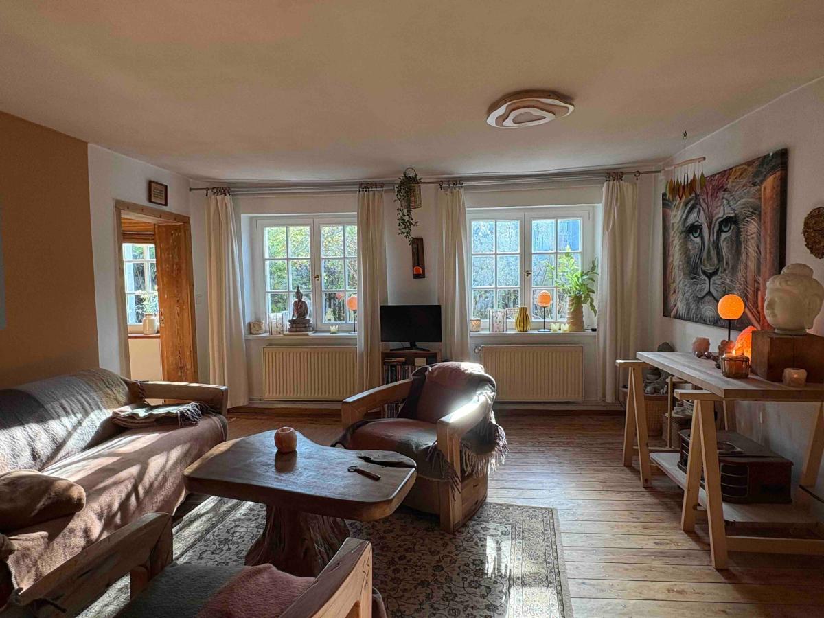 Das helle Wohnzimmer wurde mit einem Kaminofen ausgestattet. Die historischen Holzdielen wurden überarbeitet und auf ökologischer Basis geölt. Auch die dazu passenden Holztüren fügen sich in die gemütliche Atmosphäre dieses historischen Gebäudes hervorragend ein.