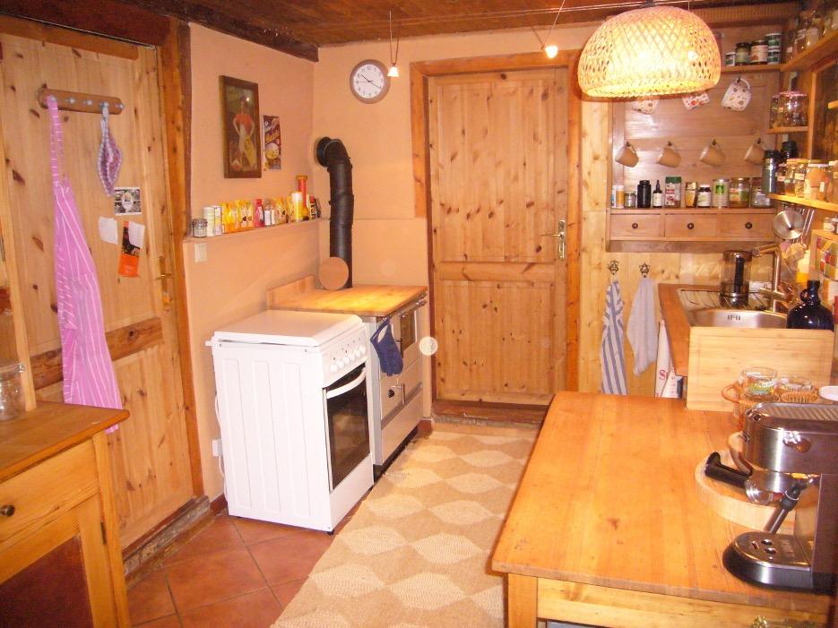 Die Küche ist groß genug für einen Essplatz und bietet neben dem Elektroherd auch eine Wärme spendende Küchenhexe (neueren Datums).