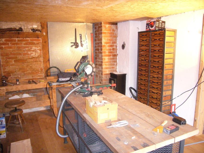 Das Gebäude wird zur linken Hälfte als Werkstatt genutzt und ist als solche ausgebaut worden. Aufgrund der momentan niedrigen Decken von ca. 2 m (diese wurden abgehängt und betragen im Rohbaumaß ca. 2,20 m) wäre für den linken Gebäudeteil eine Wohnnutzung mit gewissen Einschränkungen verbunden. Die Deckenhöhe in der Waschküche beträgt 1,80 m.