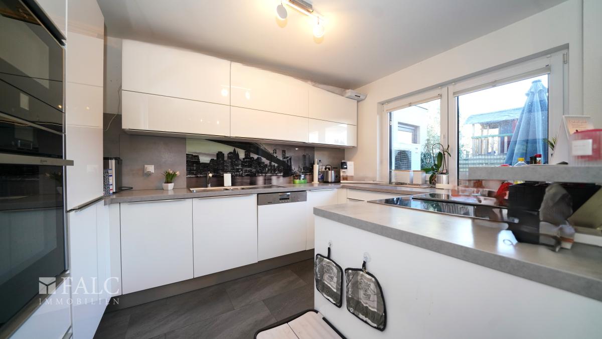 Die offene, moderne Einbauküche bietet reichlich Stauraum dank glänzend weißer Fronten und durchgängiger Ober- und Unterschränke. Die Arbeitsflächen in Betonoptik verleihen dem Raum eine klare, zeitgemäße Ästhetik. Hochwertige Elektrogeräte, ein großer Fensterbereich mit viel Tageslicht sowie ein stilvoller Spritzschutz mit Skyline-Motiv schaffen eine elegante und funktionale Kochumgebung.