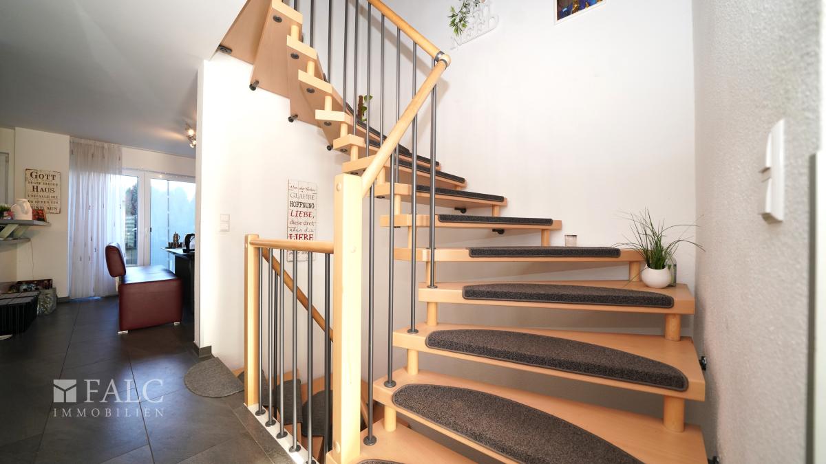 Über das helle Treppenhaus gelangen Sie in das obere Stockwerk, wo sich der großzügige Wohnbereich befindet.