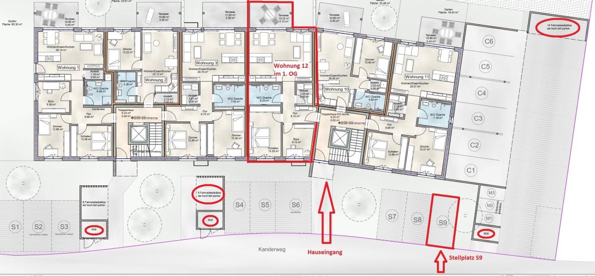 Zur Wohnung gehören ein Kellerraum sowie ein Stellplatz vor dem Haus. Ebenso gibt es abschließbare Häuschen zum Abstellen der Fahrräder.