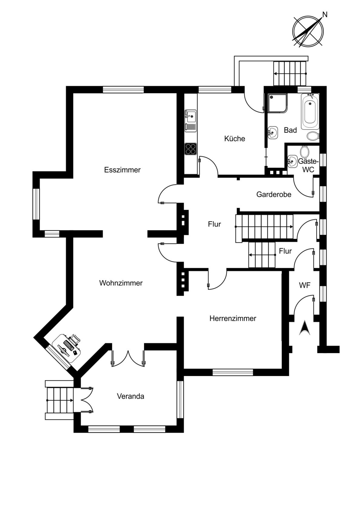 Auf einer großzügigen Wohn- und Nutzfläche von ca. 334 m² verteilen sich zurzeit acht gut geschnittene Zimmer, eine Veranda, zwei Küchen und zwei Bäder über Erd-, Ober-und Dachgeschoss.