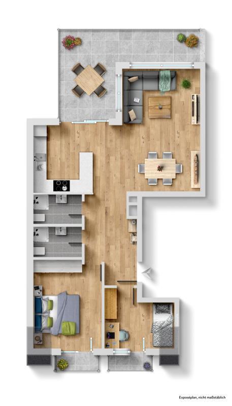 Der offen gestaltete Wohn- und Essbereich überzeugt durch seine helle Atmosphäre und den direkten Zugang zur großzügigen, umlaufenden Westterrasse. Diese bietet ideale Voraussetzungen für sonnige Nachmittage und entspannte Abende im Freien. Zwei komfortable Schlafzimmer sowie 2 Bäder ermöglichen eine flexible Nutzung.