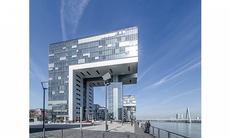 Das Kranhaus Süd ist eines von drei architektonisch herausragenden 17-stöckigen Luxus-Bürogebäuden im Kölner Rheinauhafen. Die drei Gebäude sehen aus wie ein auf den Kopf gestelltes L und erinnern an die früher im Hafen installierten Kräne.