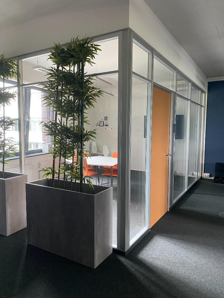 Das Office lässt sich in drei Räume unterteilen: die Community-Area, den Showroom und die Silent-Area, in welcher auch der bereitgestellte Schreibtischplatz ist. Im Showroom stehen, wie bereits erwähnt, einige 3D-Drucker und es ist ebenfalls der Raum durch den man das Büro betritt. Dort sind außerdem einige 3D-Drucke ausgestellt und es gibt einen langen Tisch zum Empfang von Gästen und auch für einige Meetings der Firma. Wenn man in das Büro reinkommt befindet sich links die Silent Area und auf dem Weg dorthin auch die Toiletten, rechts befindet sich die Community Area. Die Community Area ist der Bereich, in dem sich der Großteil unserer Mitarbeiter aufhalten und arbeiten. Dort ist ebenfalls der Kühlschrank, die Mikrowelle und die Kaffeemaschine, welche Mieter mit nutzen können. Die Silent Area ist etwas weniger aktiv genutzt, aber auch dort halten sich Mitarbeiter auf, also ist eine ganz stille Geräuschkulisse unwahrscheinlich, jedoch werden dort weniger laut Gespräche geführt. Sowohl in der Community Area, als auch in der Silent Area gibt es jeweils einen Meetingraum, welcher durch Glaswände vom Rest des Büros abgetrennt ist. Gestattet ist dem Mieter die Mitnutzung dieses zweiten Meetingraums in der Silent Area.