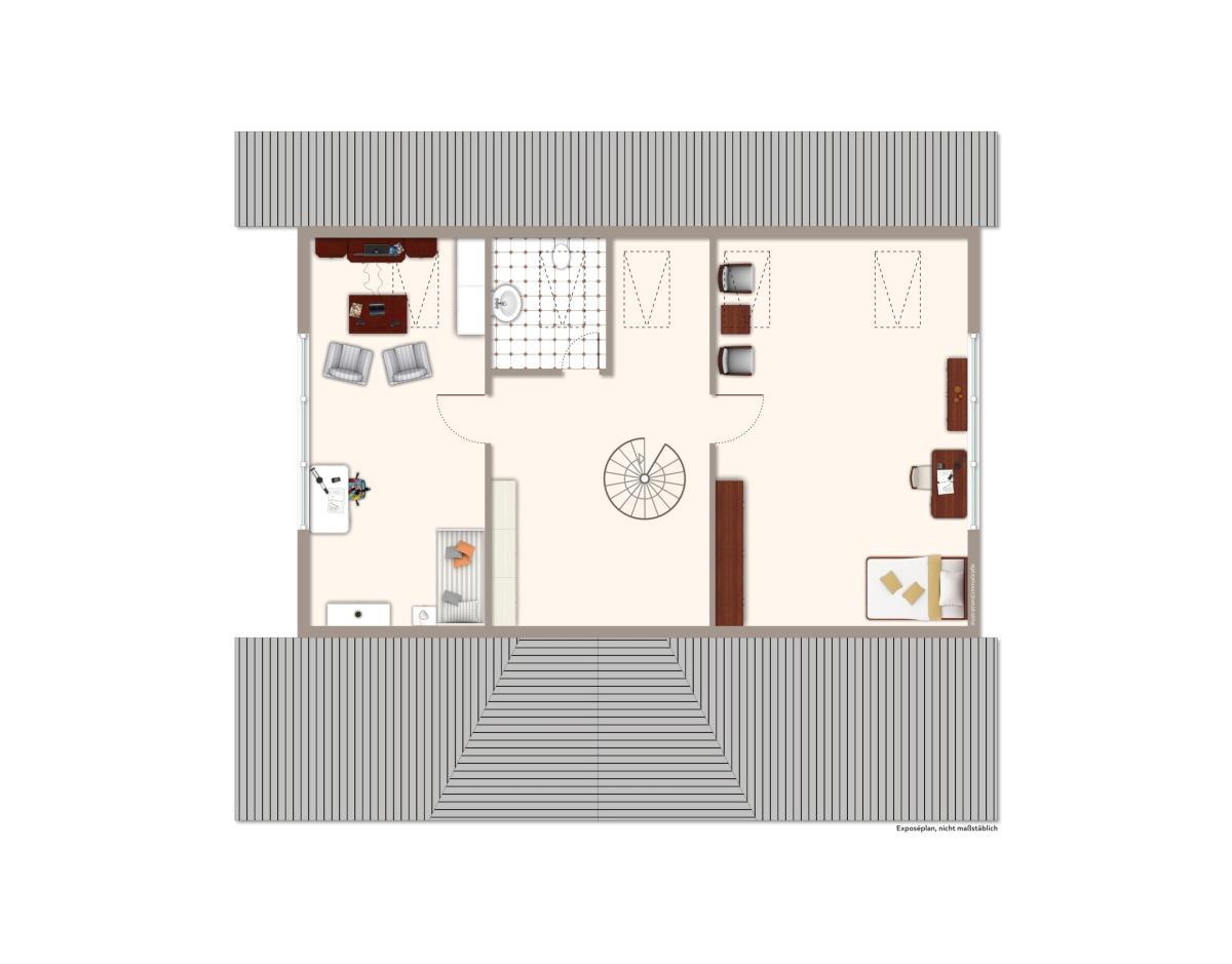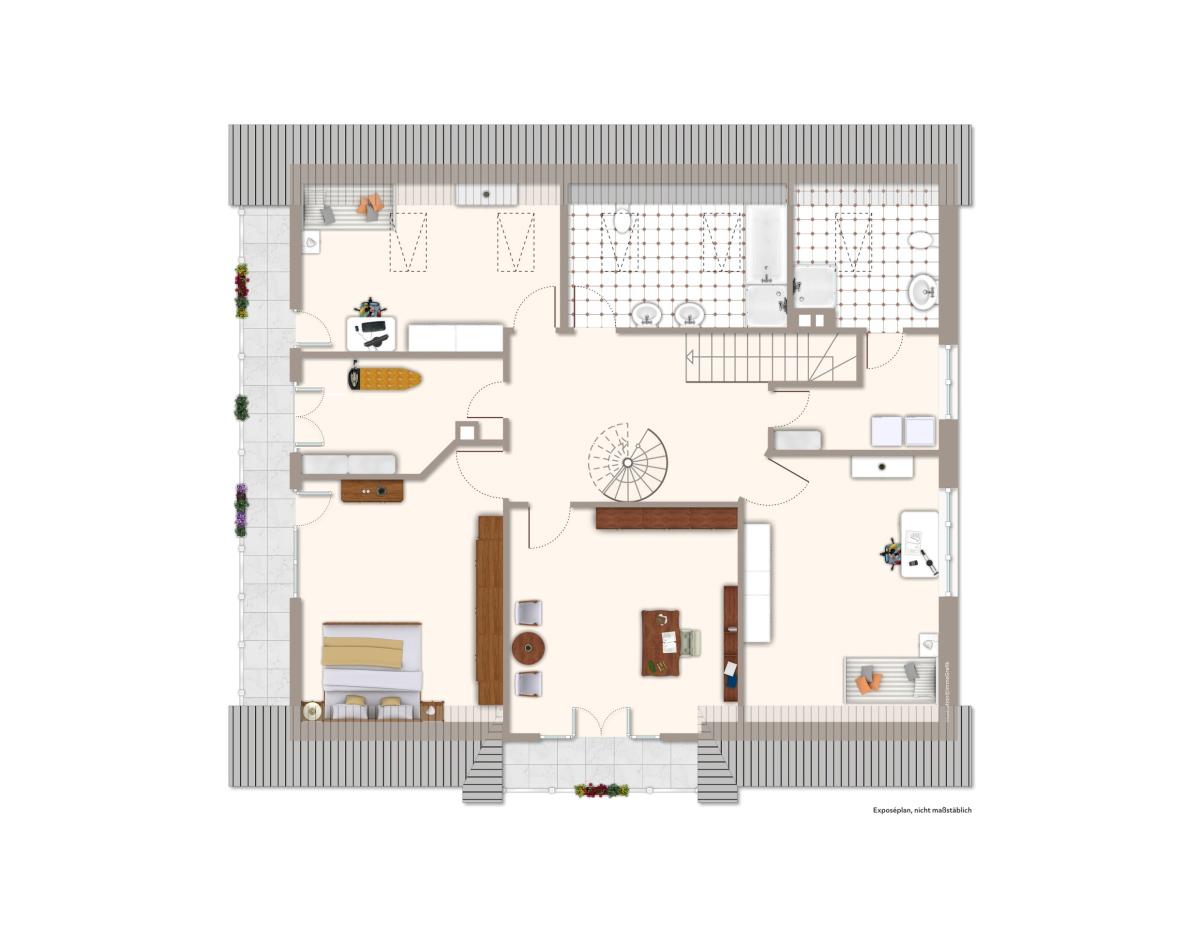 Dachgeschoss: 5 x Zimmer (Schlafen, Arbeiten, Ankleide), 1 x Bad mit Dusche und Wanne, 1 x Bad mit Dusche, 1 x HWR, 2 x Loggia.